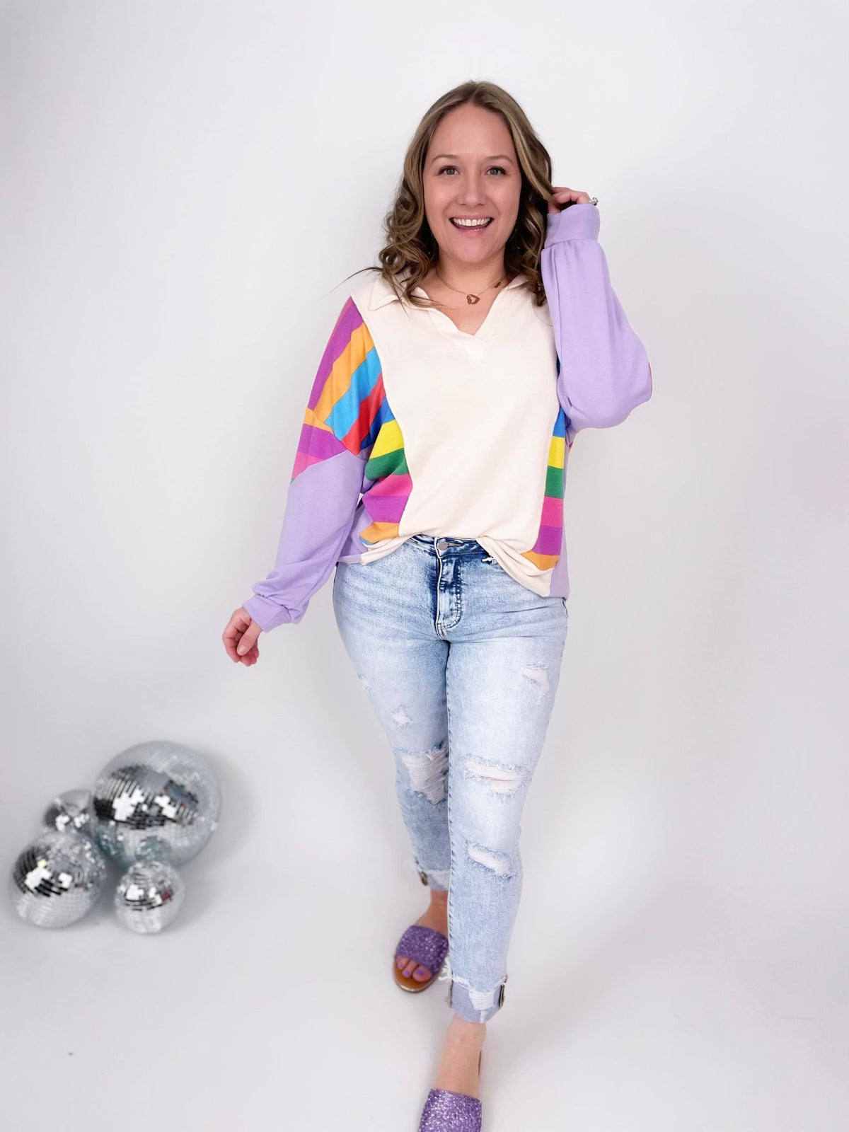 Get ready to show your true colors in our oversized True Colors Pullover! With a deep V neck, playful multicolor stripes, and a unique color block design, this collared top is anything but basic. Made from washed French terry fabric, it offers a comfy and cozy fit. The bubble long sleeves and reverse stitches add an edgy touch to this must-have pullover. Upgrade your wardrobe with this statement piece today!