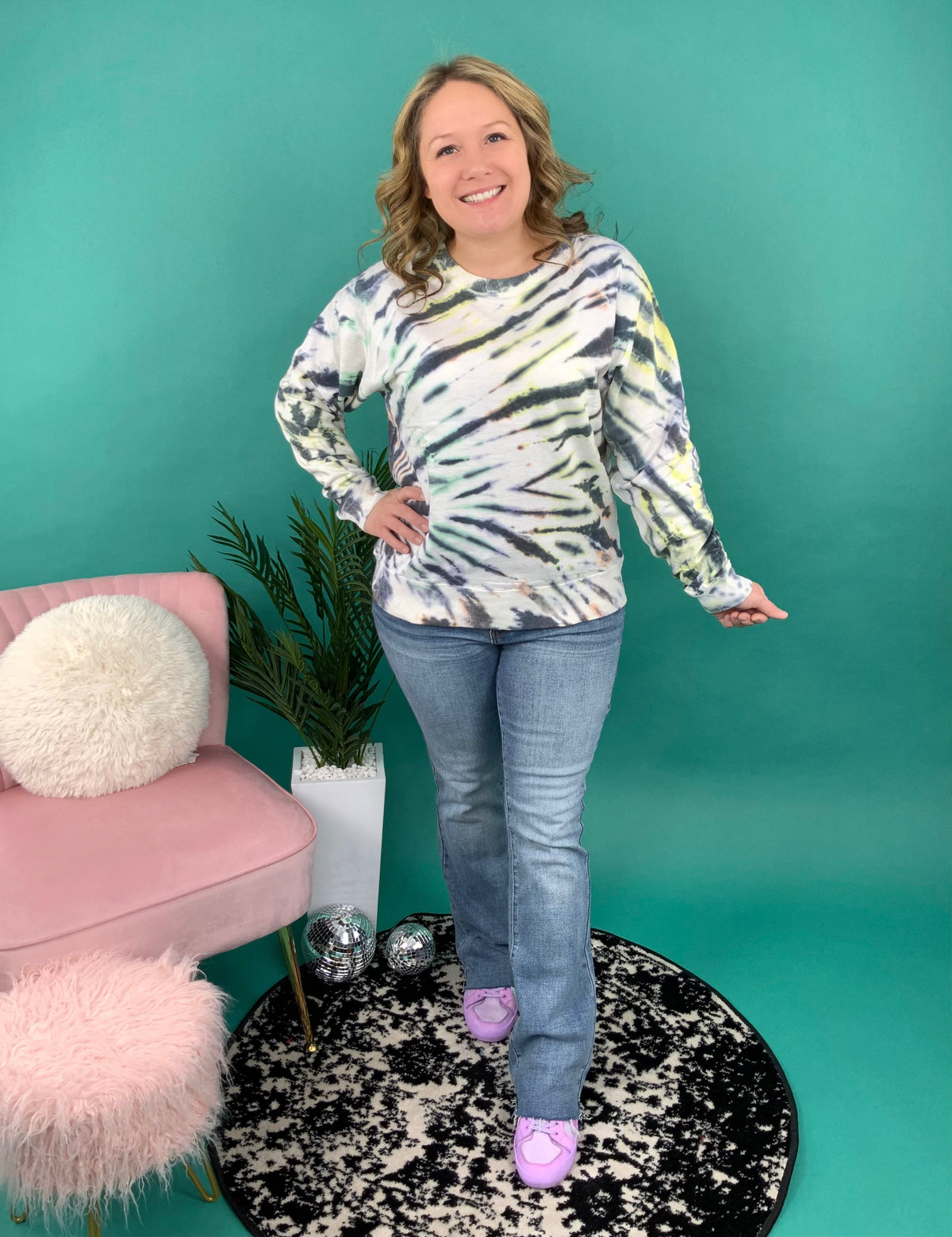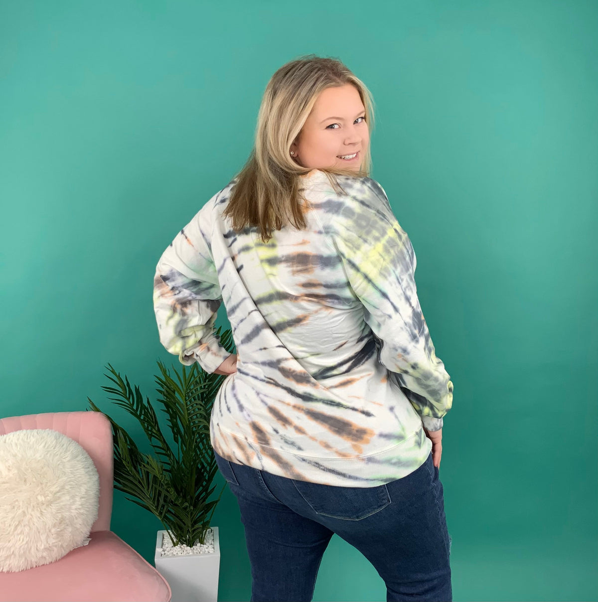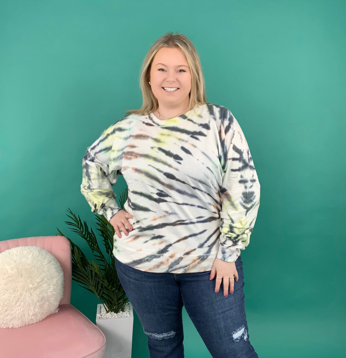 Your multicolor block stripped tie dye is here! These colors blend so well and will look best with some blue jeans. It is designed to fit relaxed and cozy with a comfortable pair of leggings to match.