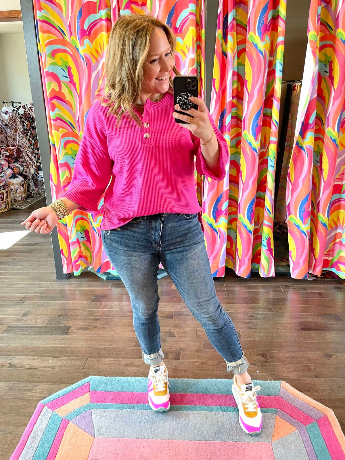 Waffle Weave Button Top in Hot Pink