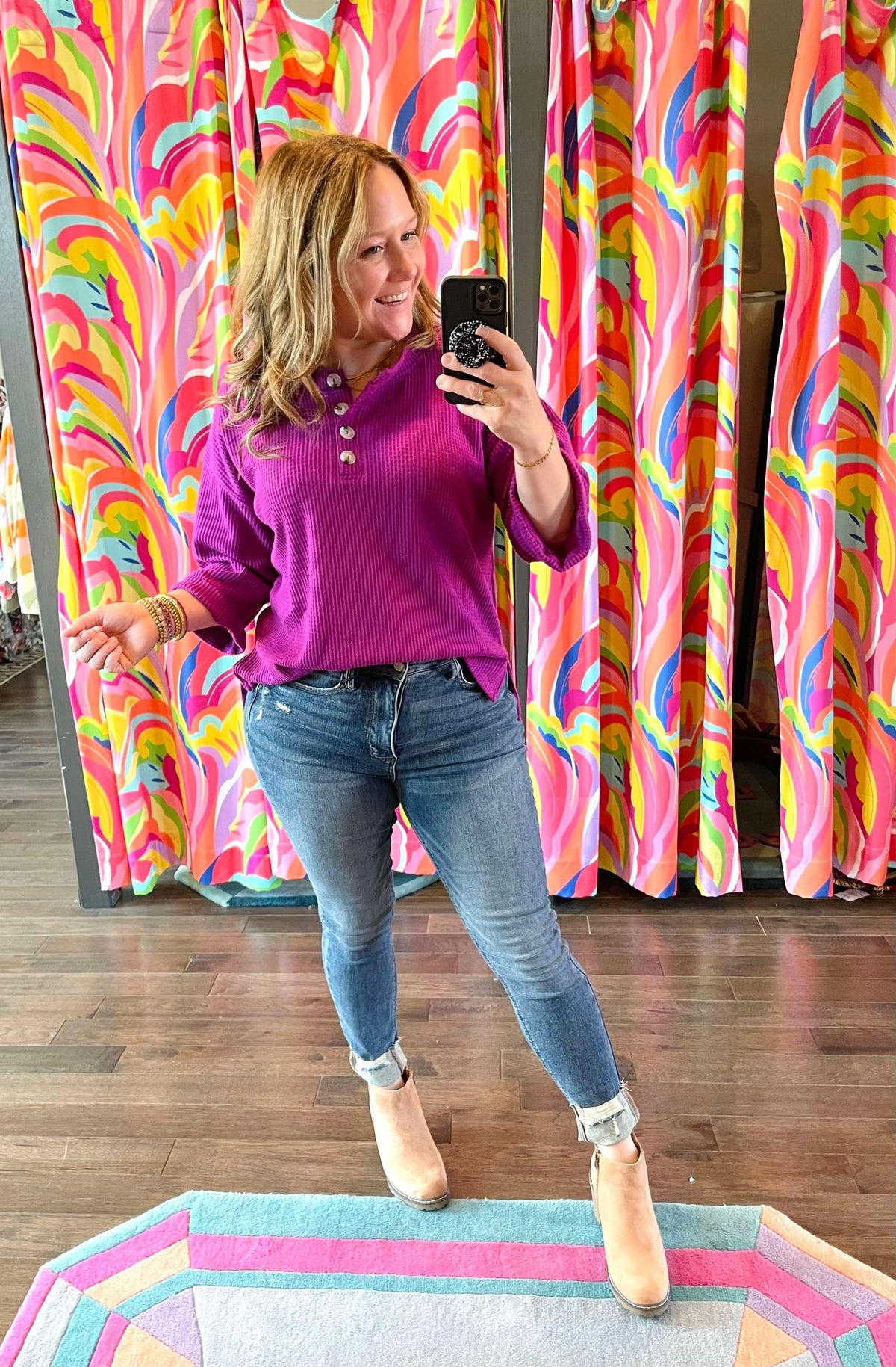 Introducing our Waffle Weave Button Top - the best combination of comfort and style! The waffle knit gives a cozy Fall feel, while still being breathable and lightweight! The buttons are functional, and the rolled sleeves add a touch of elegance. This is the perfect top for the season to mix and match with shackets and jackets, or wear on its own with just about anything!