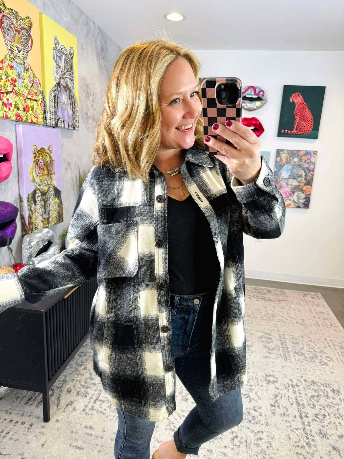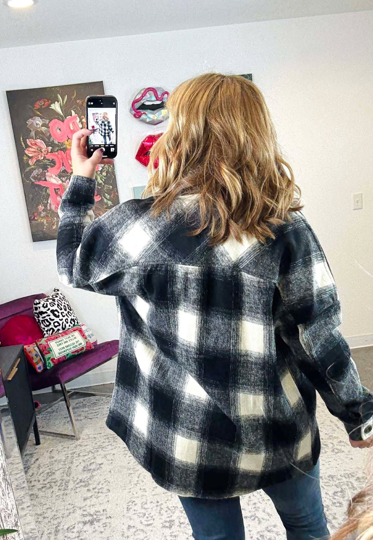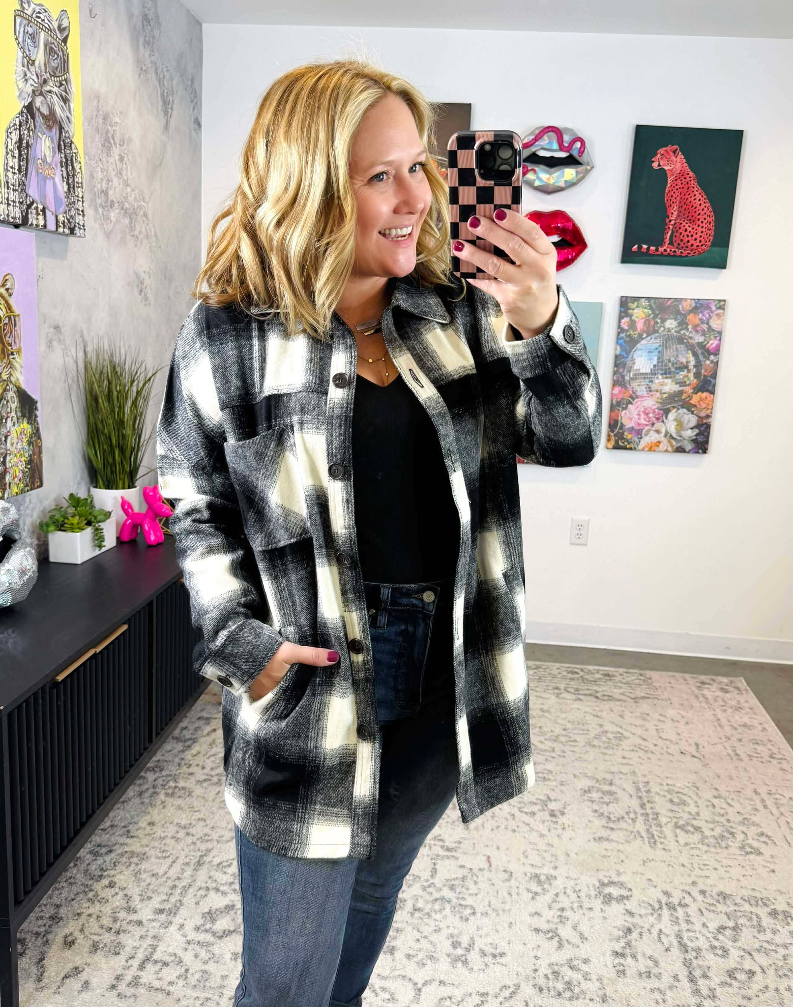 As long as this shacket is in your wardrobe, you'll never have a boring look! This shacket features long sleeves, an oversized fit, pockets, soft fabric, and button cuffs. It'll look great with some leggings and combat boots.