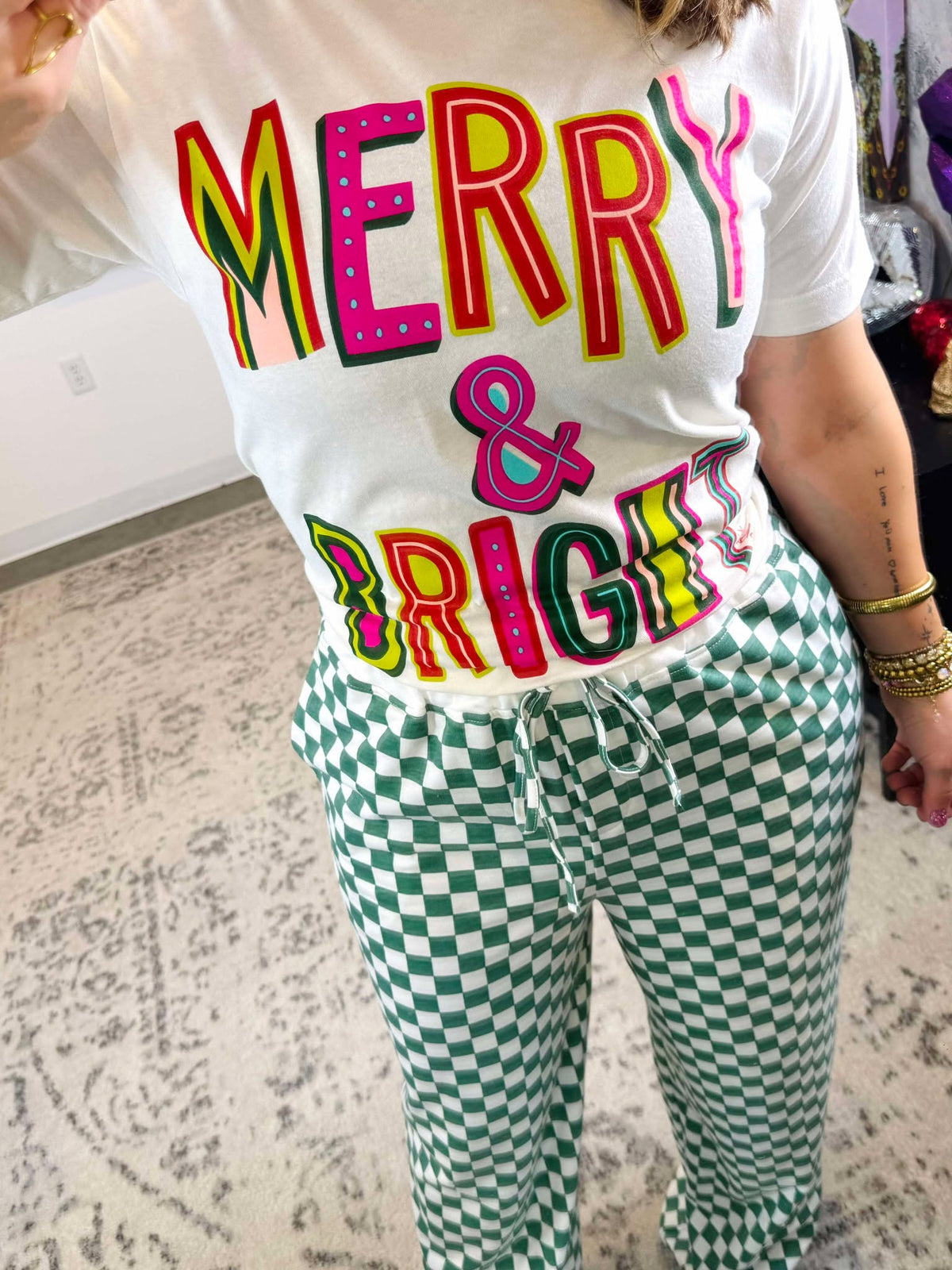 Celebrate the season in style with this colorful Merry & Bright tee! Designed to spread holiday cheer, its vibrant hues and comfy fit make it perfect for festive gatherings or cozy nights in. Available in sizes S through 3X, it's made to keep you merry, bright, and smiling all season long.