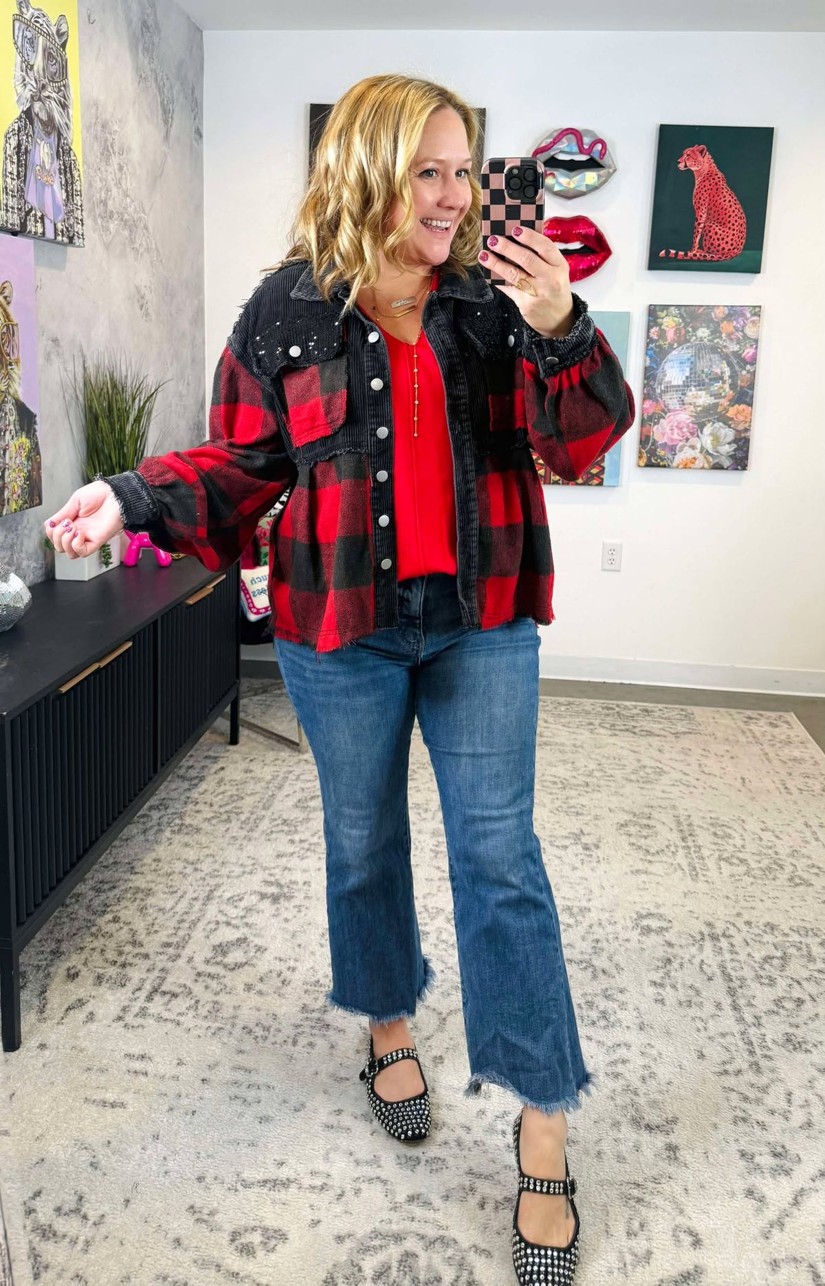 Get ready to meet the absolute game-changer in fashion: the Layla Buffalo Plaid Cord Sequin Acid Wash Shacket by JadyK! Yup, you heard that right - we've gone and combined all the coolest stuff into one mind-blowing outfit that'll seriously make your jaw drop. Picture this: sequins, corduroy, and buffalo plaid fabric, all hanging out together in perfect harmony. Who would've thought that this mashup would be so darn powerful? Now, let's break it down. Sequins? Check. Corduroy? Check. Buffalo plaid? You bet. It's like we've cracked the code to the ultimate style combo that's out of this world. But wait, there's more! We've gone the extra mile and added in some acid wash vibes, a sequin raw hem for that extra bling, and a low-high back round hem that's basically irresistible.