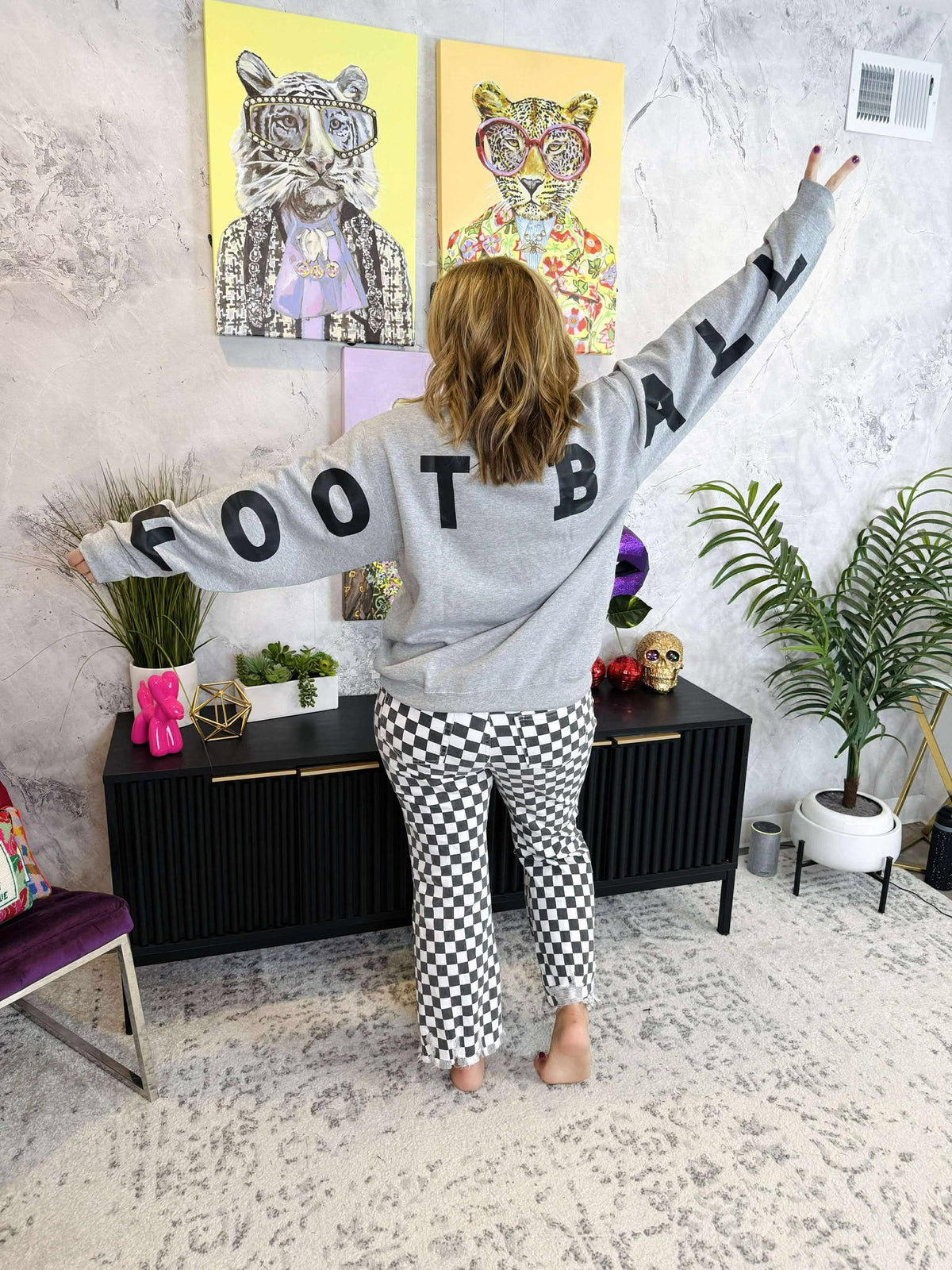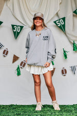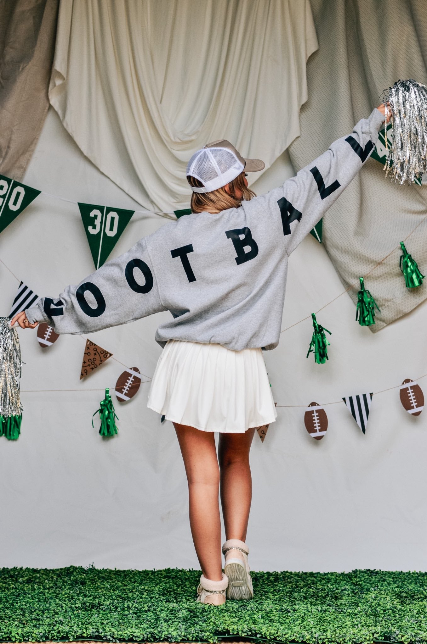 Get ready to cheer in style with this grey sweatshirt! The front proudly says "Game Day," while the back boldly spells out "Football," making it perfect for any football fan. Cozy and fun, it’s your go-to for game day excitement and casual comfort.