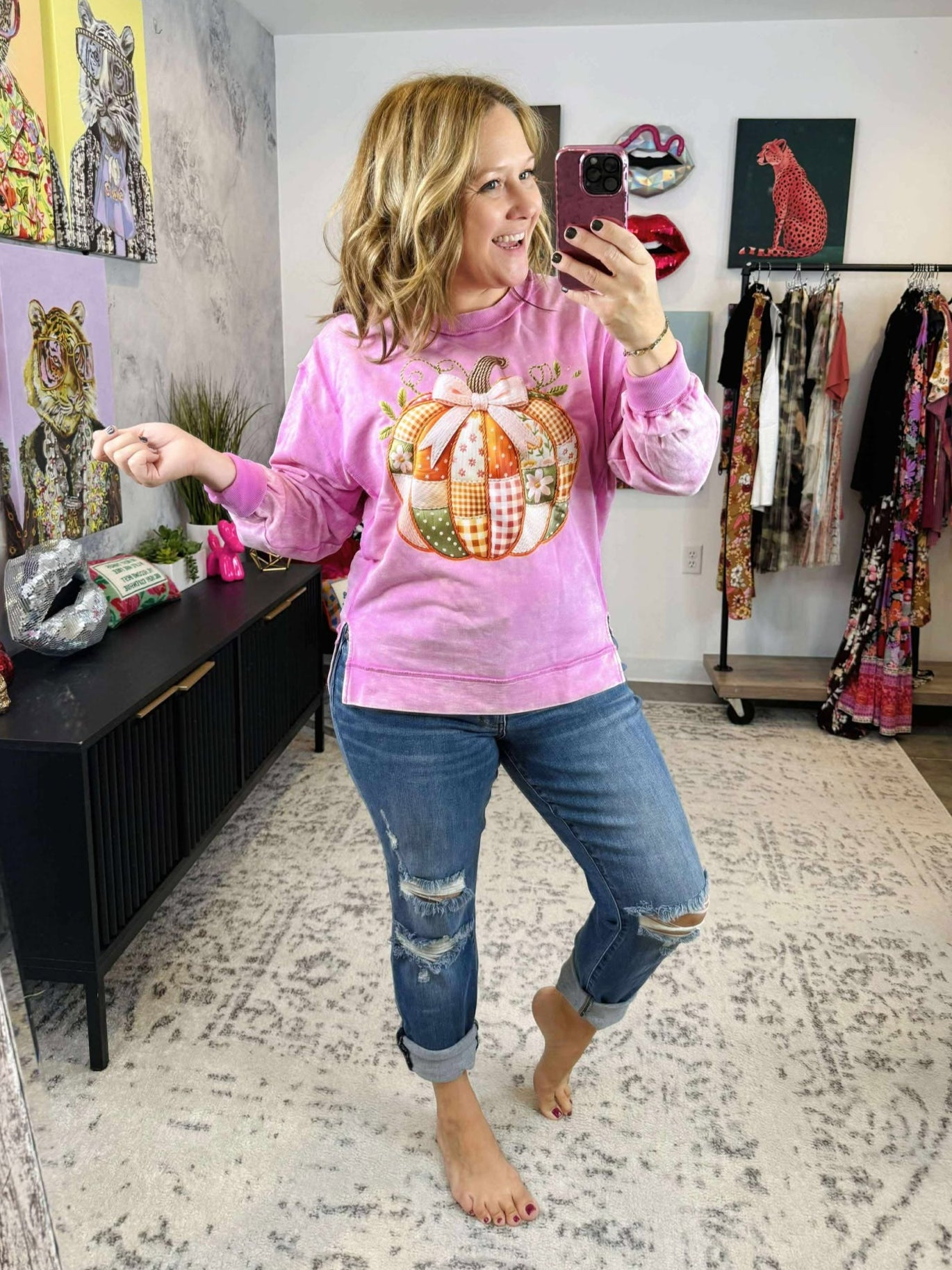 Add a fun twist to your casual style with this Pink Pumpkin Graphic Sweatshirt. Made from 100% acid-washed cotton French terry, it features playful exposed seam details and a trendy hi-low hem for a standout look. Comfortable and unique, it’s available in sizes S to 3X to fit your vibe perfectly.