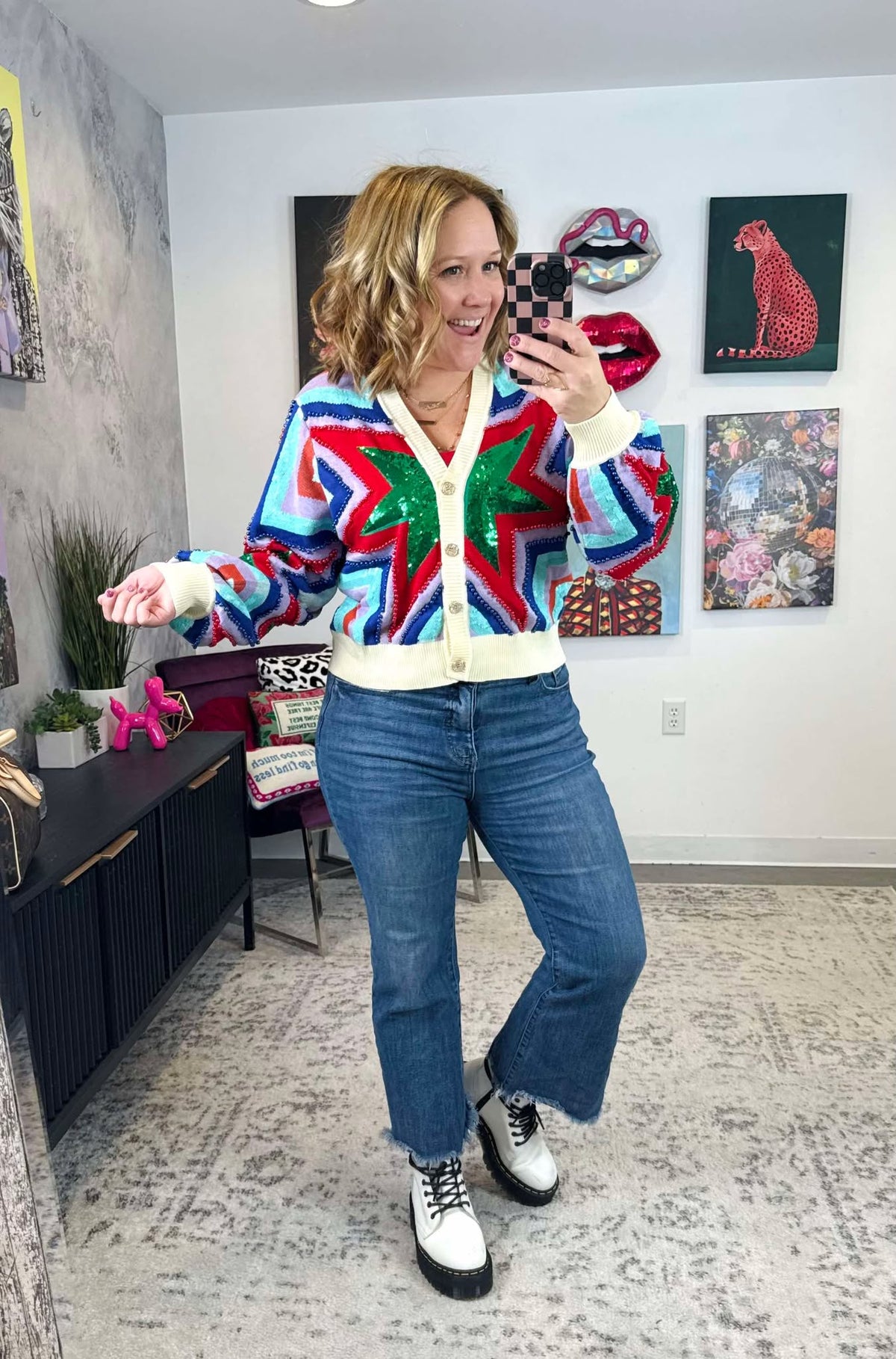 Shine bright like the star you are in this dazzling starburst cardigan! Bursting with vibrant, multi-colored sparkles that catch the light from every angle, this Queen of Sparkles piece is pure joy to wear. Perfect for adding instant glamour to any outfit, whether you're heading out for a night on the town or just want to feel fabulous. Available in sizes XS-XL, so everyone can join the sparkle party. Get ready to turn heads and light up the room!