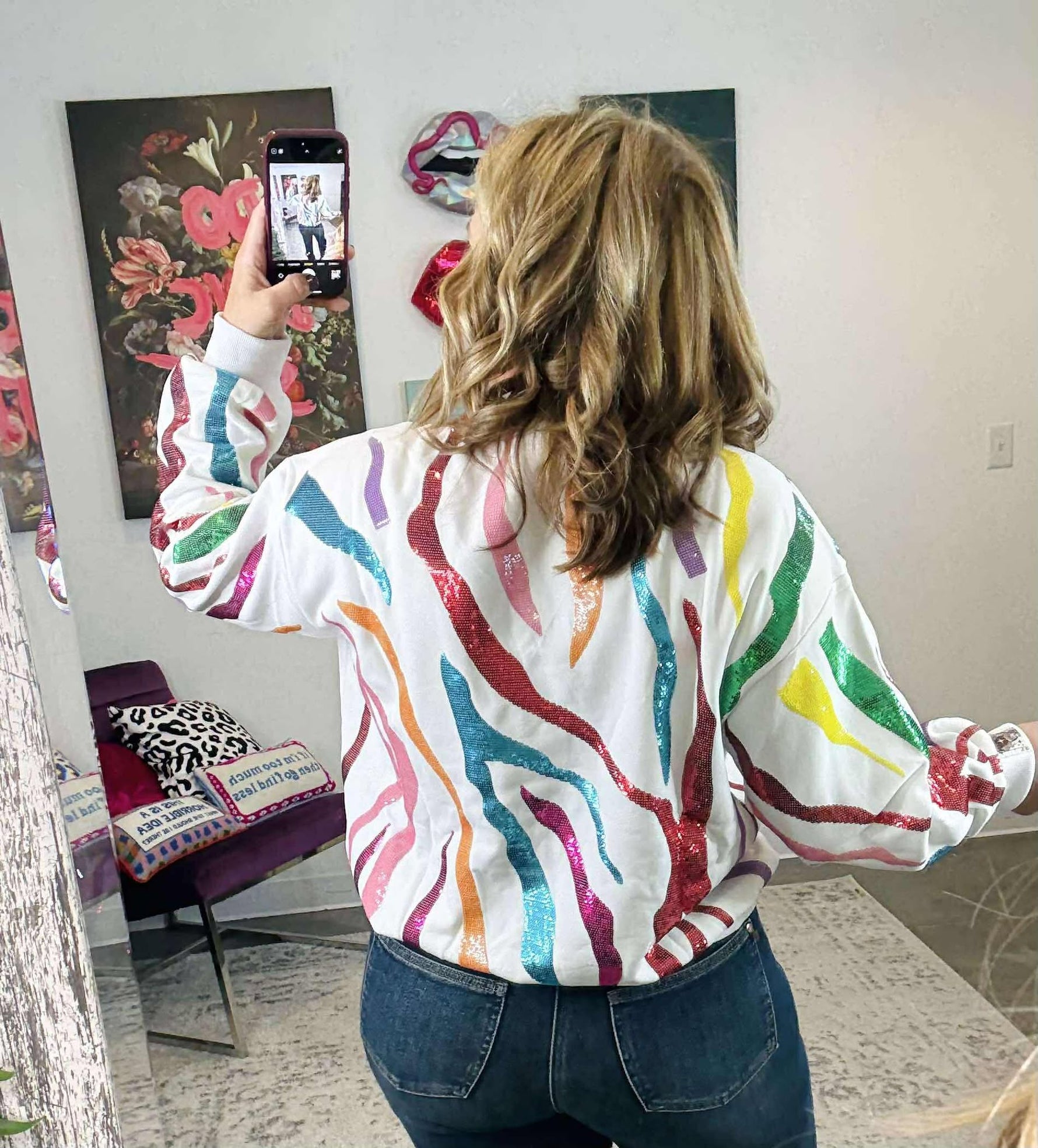 Add some wild sparkle to your wardrobe with this vibrant sweatshirt featuring colorful sequin tiger stripes. The playful rainbow hues shine brilliantly against a crisp white background, making every outfit gleam with personality. Perfect for cozy days when you want to stand out and embrace your inner queen of sparkles. Available in sizes XS to XL for a comfortable, flattering fit.
