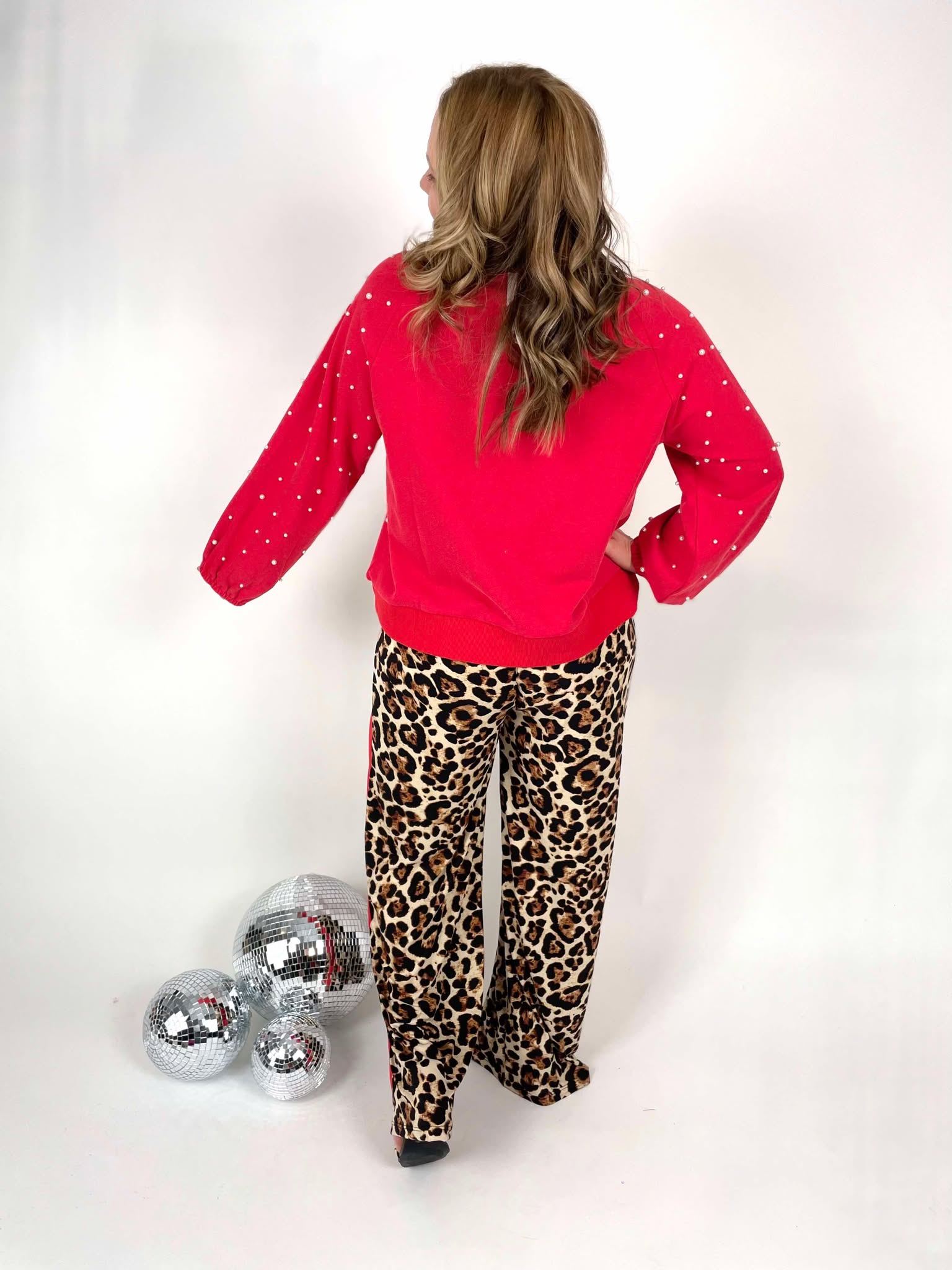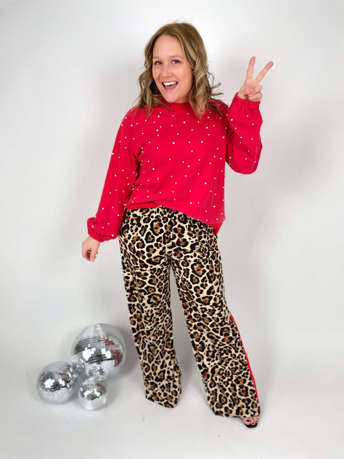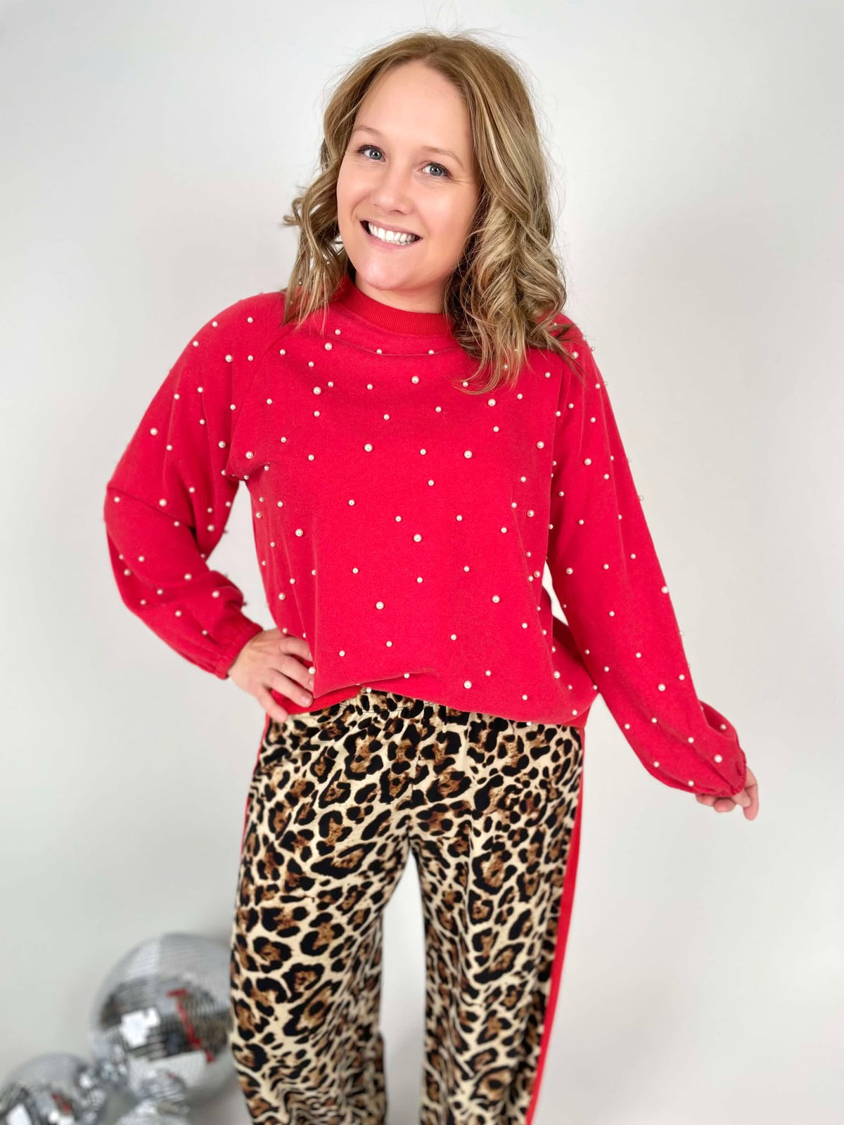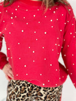 Slip into effortless elegance with this stunning red pullover, where rich crimson fabric meets delicate pearl embellishments for a touch of understated glamour. Perfect for elevating your everyday look or dressing up for special occasions, this piece combines comfort with sophisticated style. The lustrous pearls catch the light beautifully, adding dimension and visual interest to the classic pullover silhouette. Whether you're heading to brunch or a night out, this versatile top is your new go-to for looking polished and put-together.