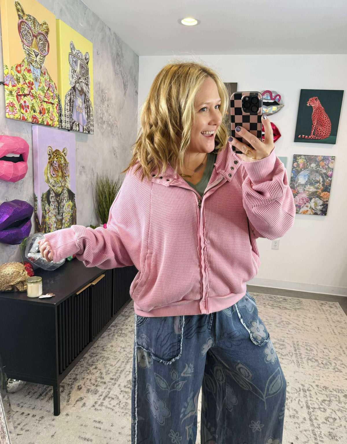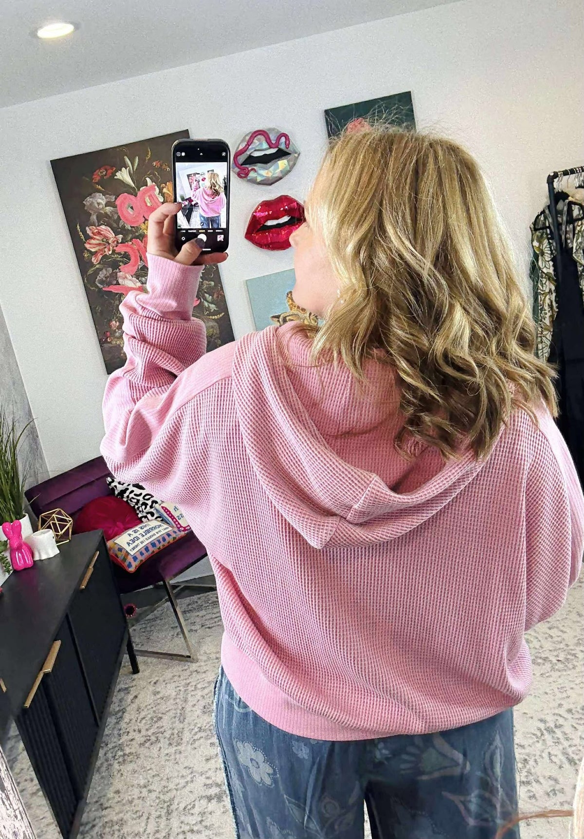 The cutest, coziest mineral washed thermal fabric zip up hoodie! Features size pockets a front zipper and button details. The attention to detail on these was not missed! High quality and so so cute!