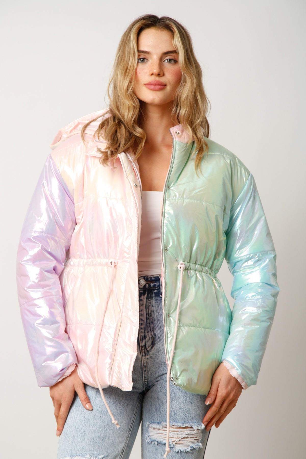 Introducing our Hologlow Puffer Jacket - the perfect blend of style and function! This hooded jacket features a front zipper and snap button closure for extra protection against the elements. The color block design adds a playful touch, while the waist drawstring allows for a customizable fit. Say goodbye to dull winter jackets with our pearlescent, padded jacket.