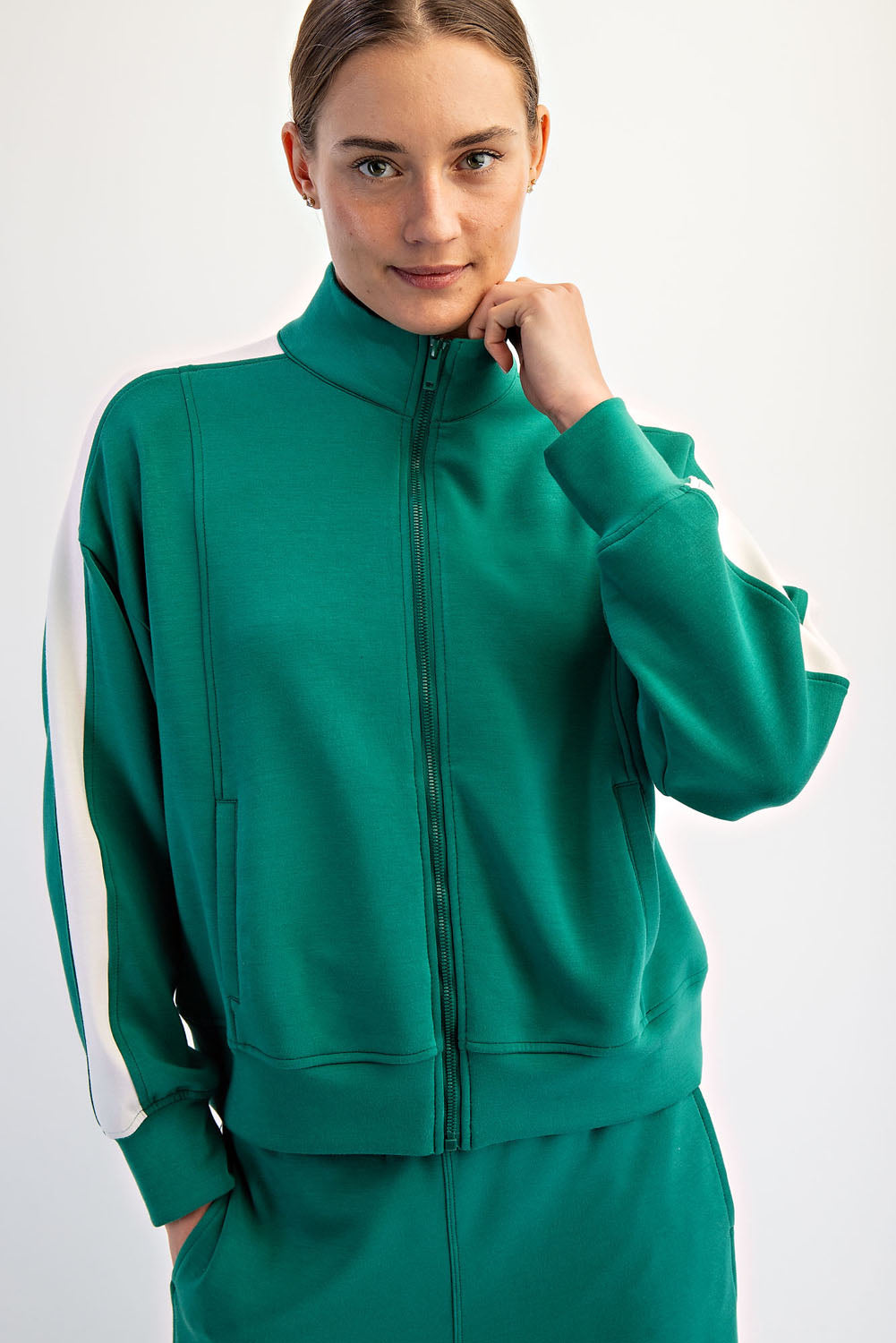 Elevate your active-chic style with this modal scuba zip-up jacket, crafted from silky smooth and lightweight fabric. Featuring sleek color contrast striping along the sleeves, it blends luxurious comfort with a sporty edge.