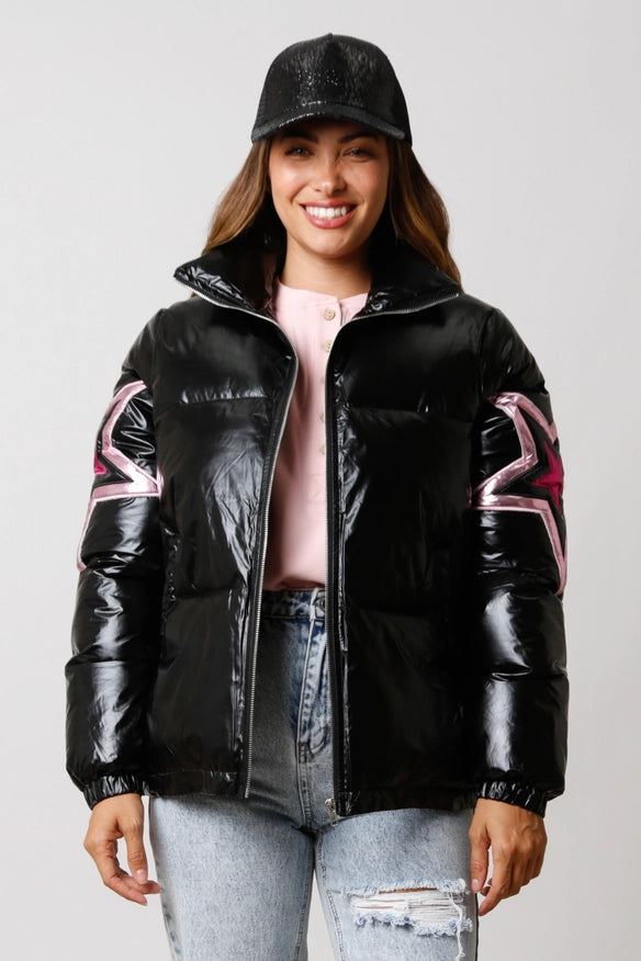 Stay warm and stylish with our Starburst Puffer Jacket! Featuring a front zipper and button closure, quilted pattern, and nested star details. Keep your hands cozy in the front pockets and add a touch of fun with rounded high-low side slits. Perfect for chilly days!