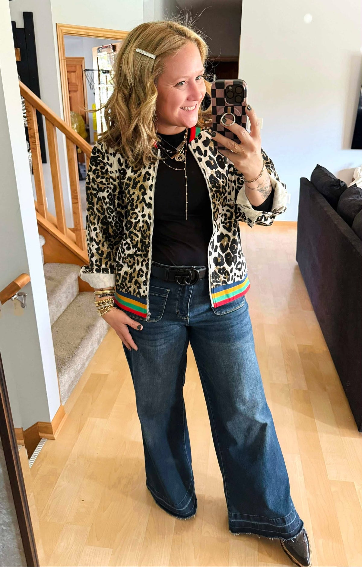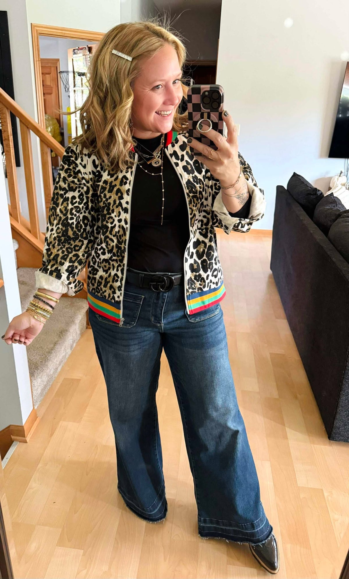 Unleash your bold side with the Wild Streak Bomber Jacket! Featuring a zip-up front and eye-catching leopard print, it’s finished with colorful ribbed bands at the neckline and hem for a fun pop. The three-tone buttons on the wrist cuffs add a playful twist to this stylish statement piece, making it perfect for turning heads wherever you go.