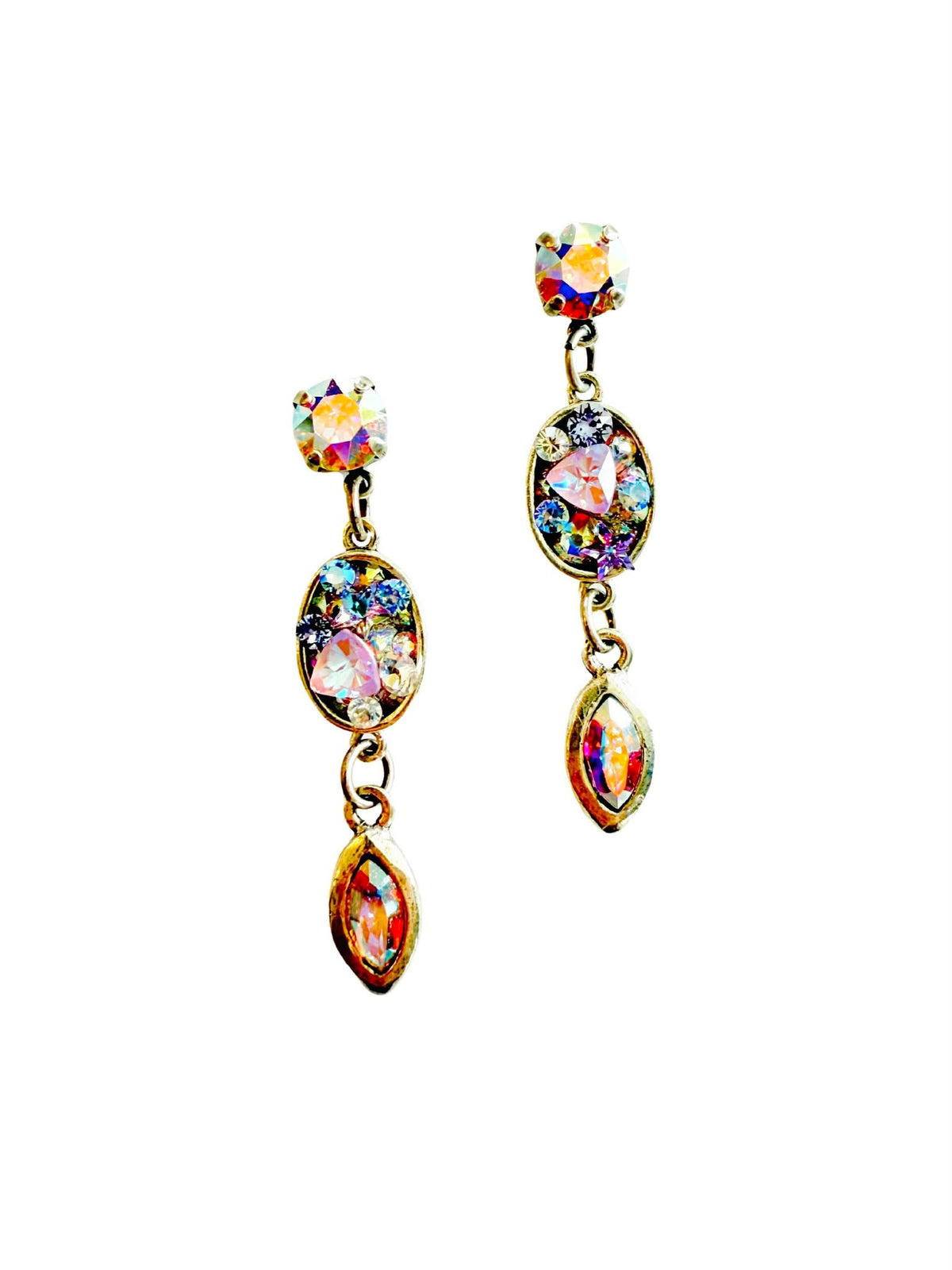 Treasure Chest Earrings set into Antique Silver Metal. Crystals in Crystal AB, Aqua, Lavender, Moonlight, Aqua AB, and Lavender DeLite.