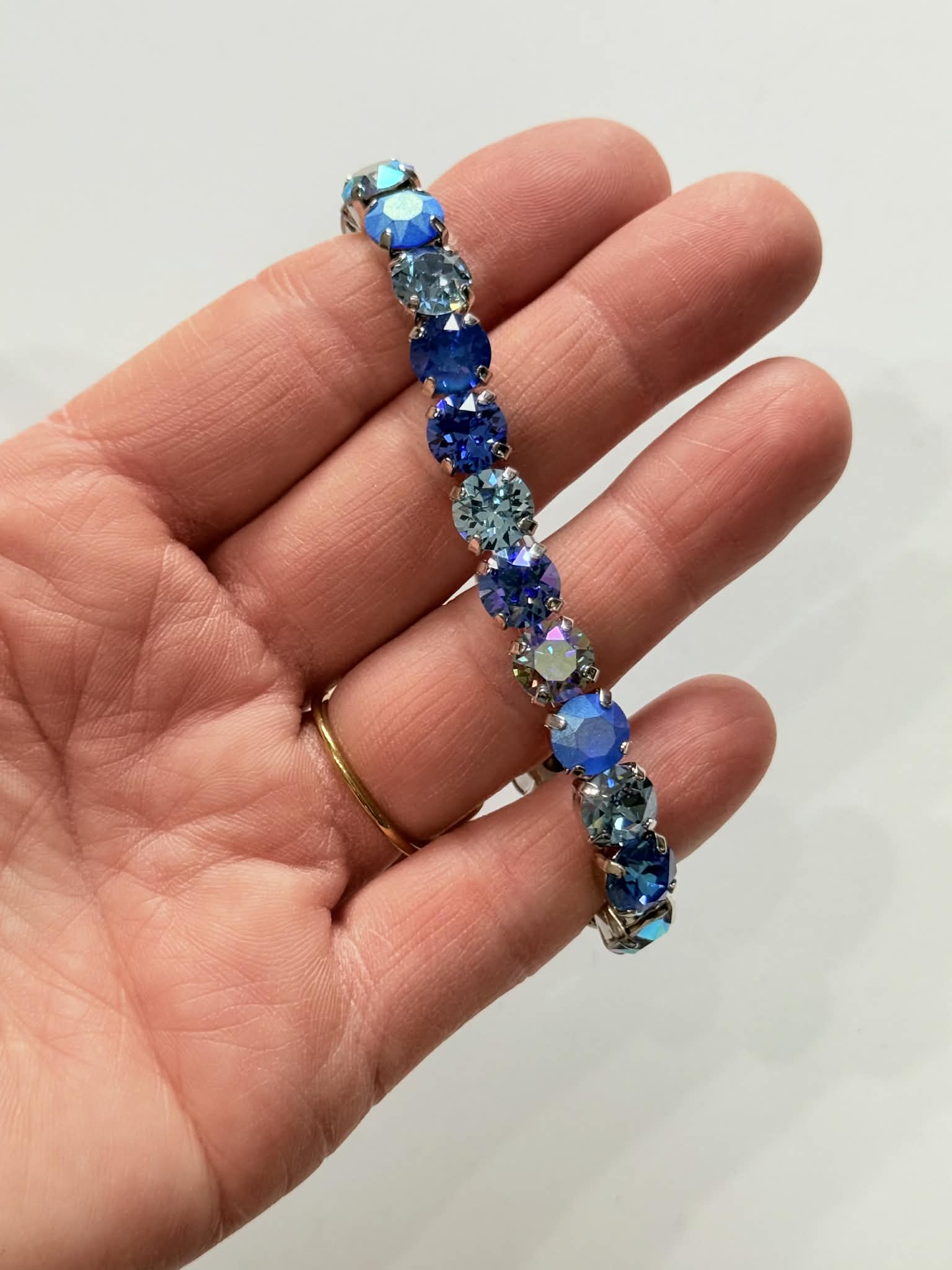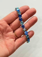 8mm Diamonds Stretch Bracelet in Blue Hues set into Shiny Silver Metal. Crystals in Sapphire, Sapphire Glacier Blue, Aqua, Royal Blue DeLite, Light Sapphire AB, Majestic Blue Pastel.