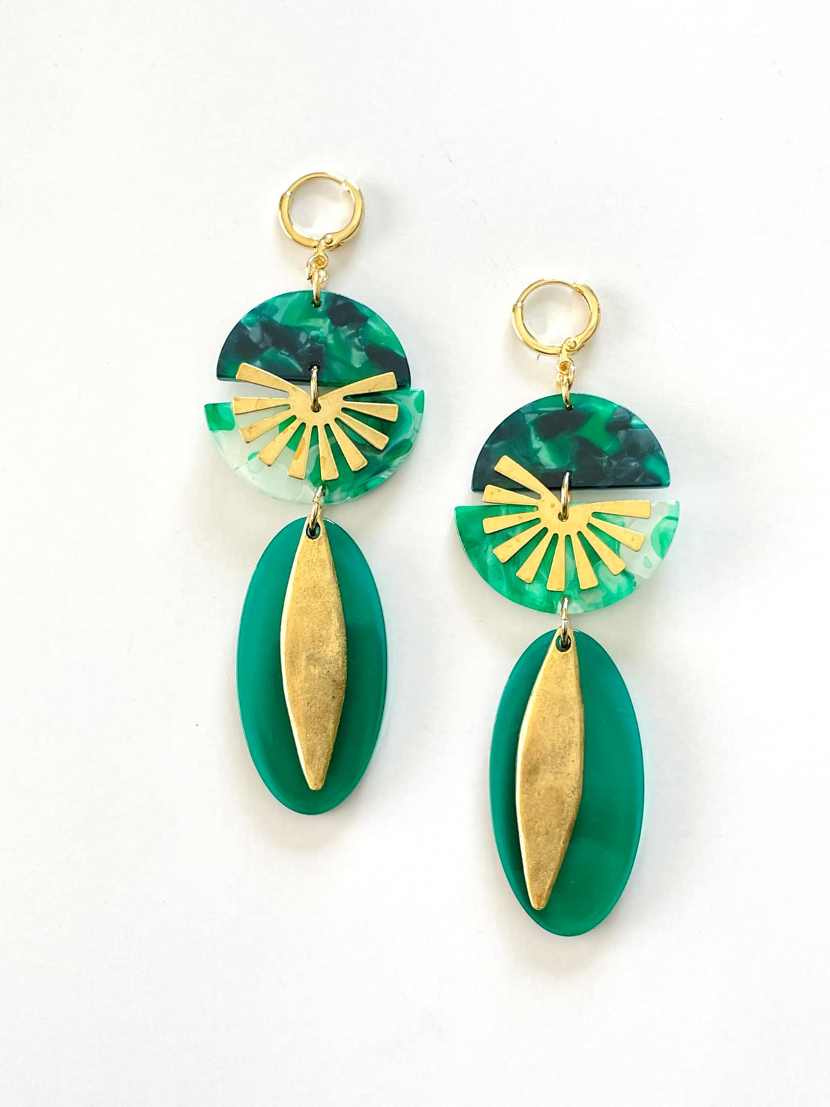 Emerald Dream Statement Earrings set into Gold Metal with Green Pendants and Gold Accents.