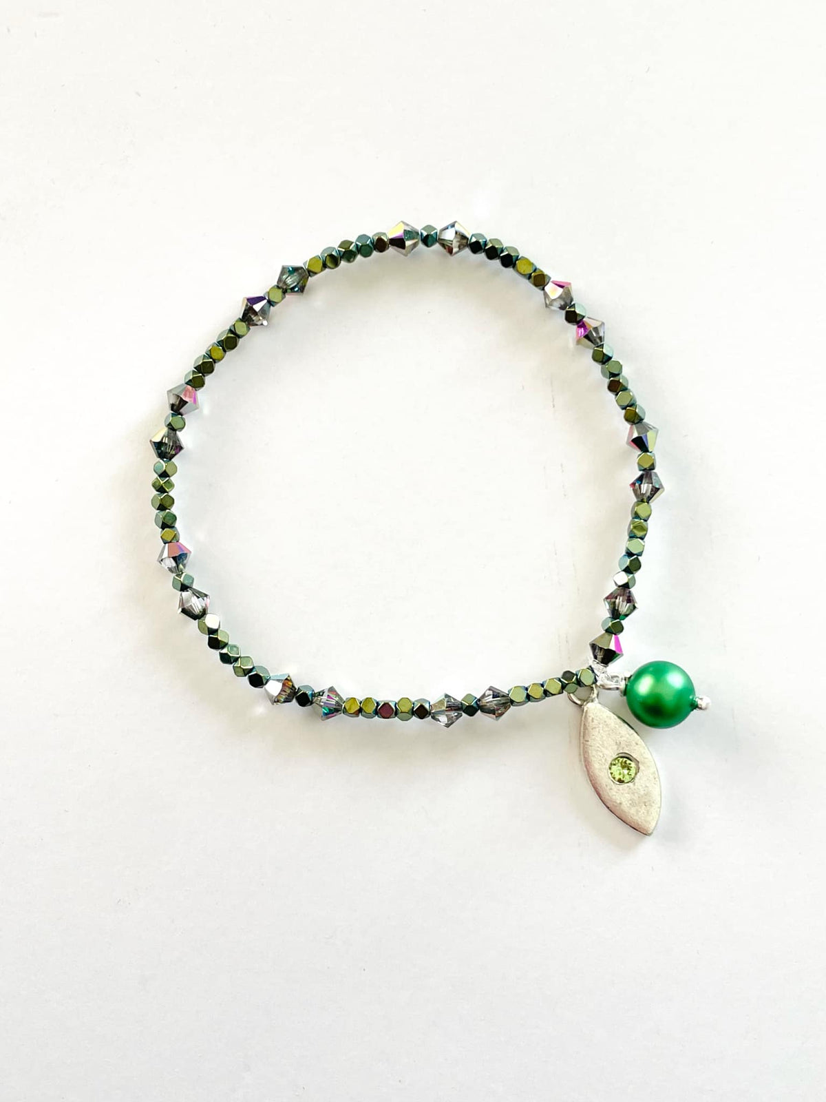 Moss Meadow Stretch Bracelet with Metallic Green Tiny Beads and Electra Crystals. Fern Green and Peridot Charm.
