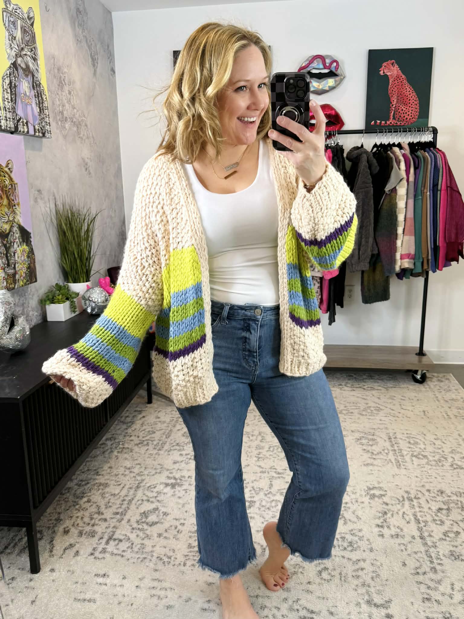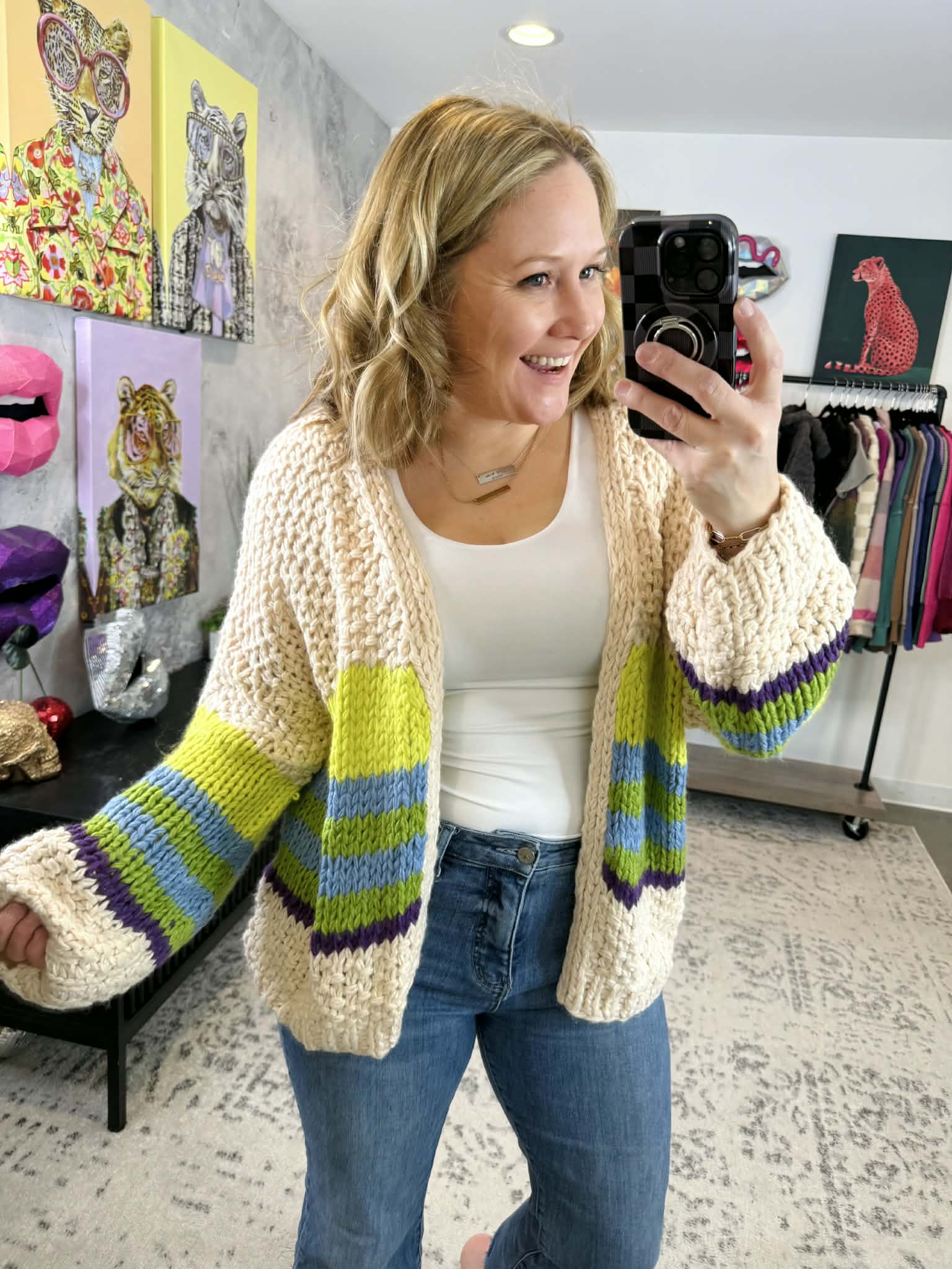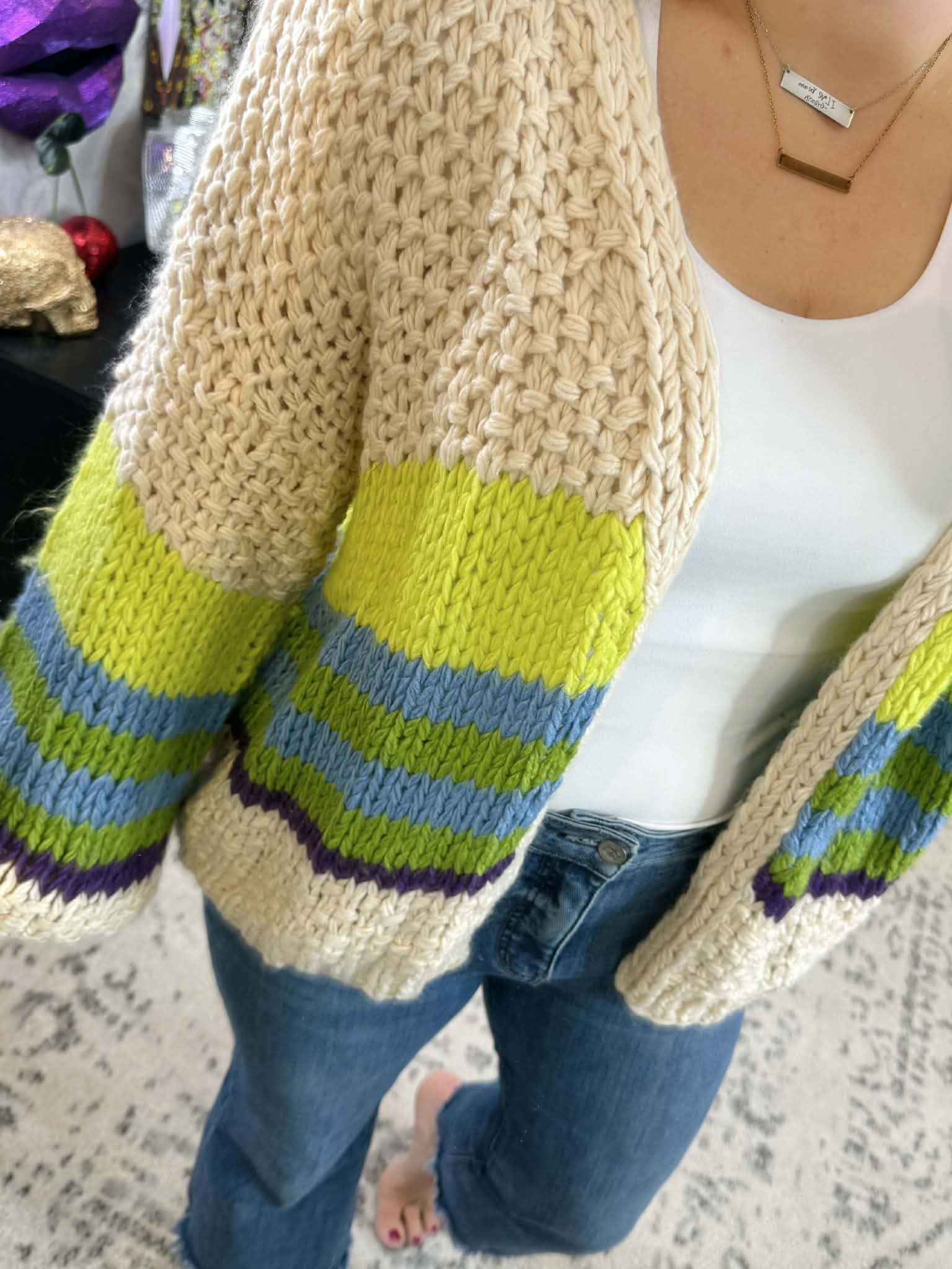 Wrap yourself in cozy charm with the Blakeley Charlotte Knit Cardigan. This adorable chunky knit piece features statement bubble sleeves and a flattering fit that works with everything in your closet. The stretchy fabric moves with you all day, whether you're layering over a tee or pairing it with your favorite dress. Perfect for casual outings or relaxed weekends. Green stripe design adds a fresh pop of color to any outfit.