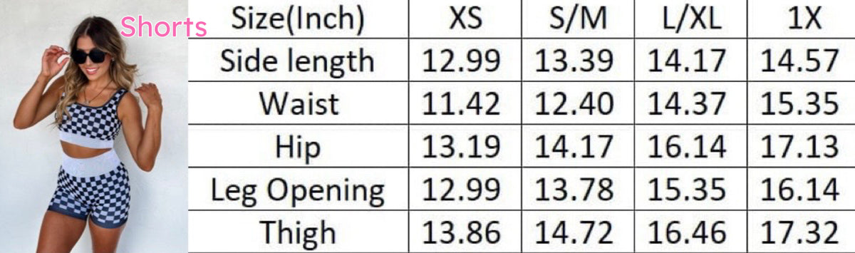 This matching set features a seamless scoop back and front bra and high-waisted biker shorts with a bold checker pattern and ultra-stretchy, sculpting two tone, knit/rib fabric. Designed for both comfort and style, the set offers a supportive fit that moves with you, whether you’re hitting the gym or running errands, this set is perfection!
