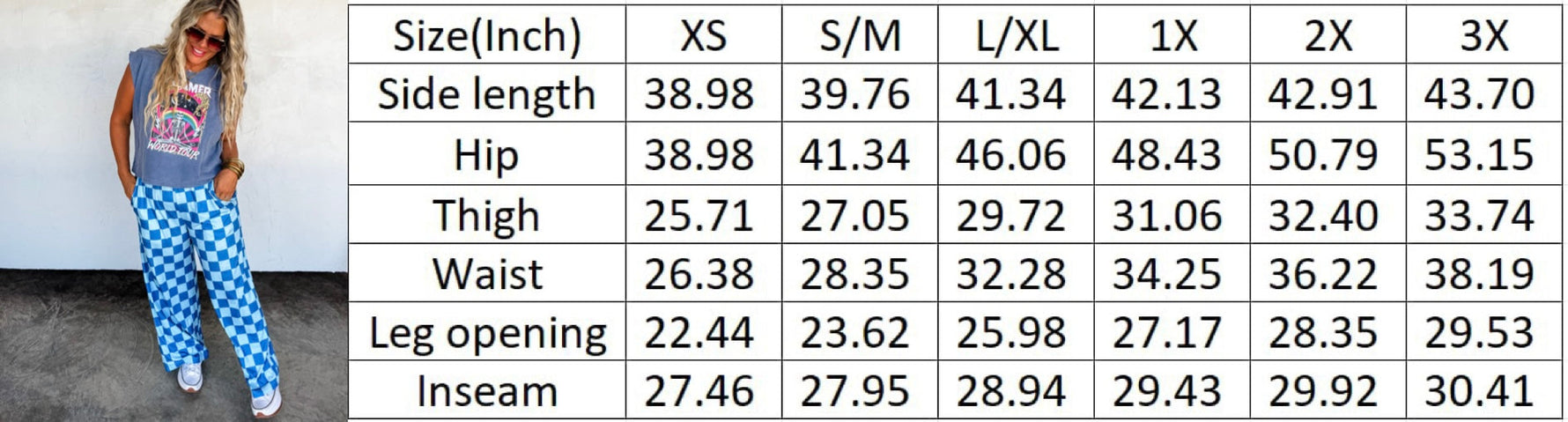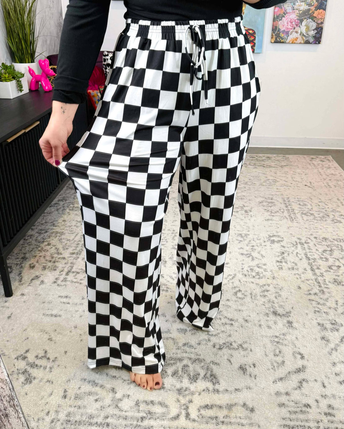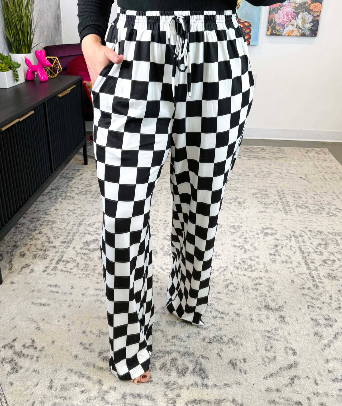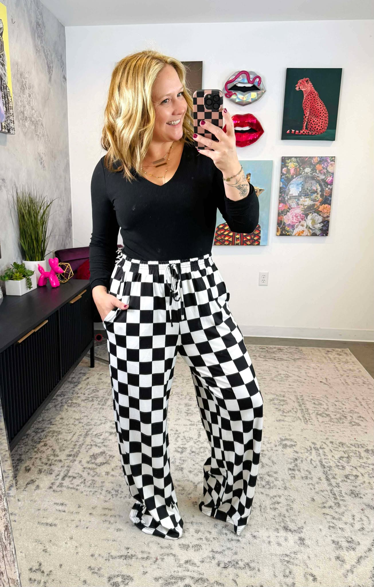 Cloud soft and so so stretchy! These bold checker pants are the perfect way to add a "pop" to any outfit!! Features front pockets, a faux tie string and elastic waist.