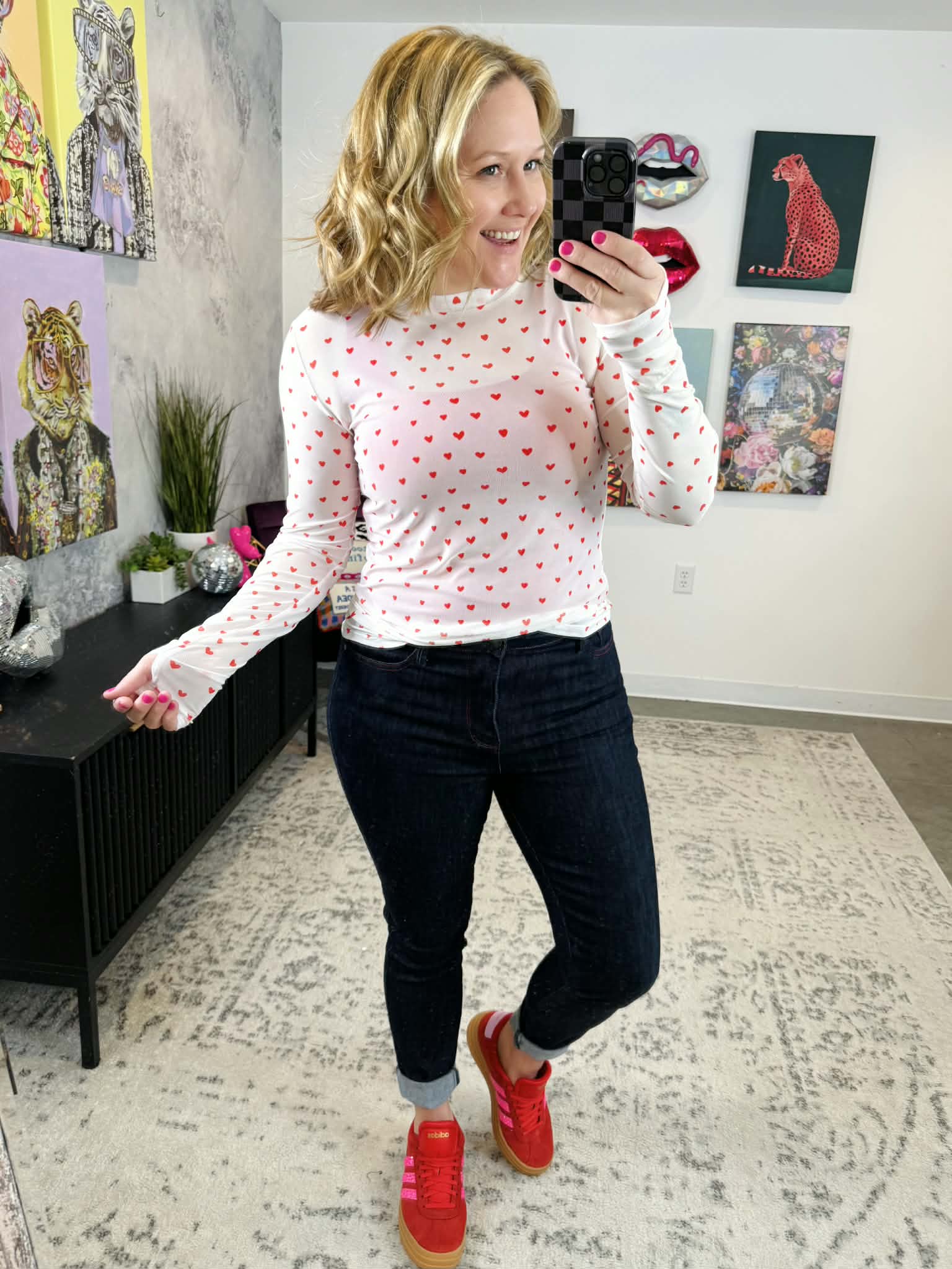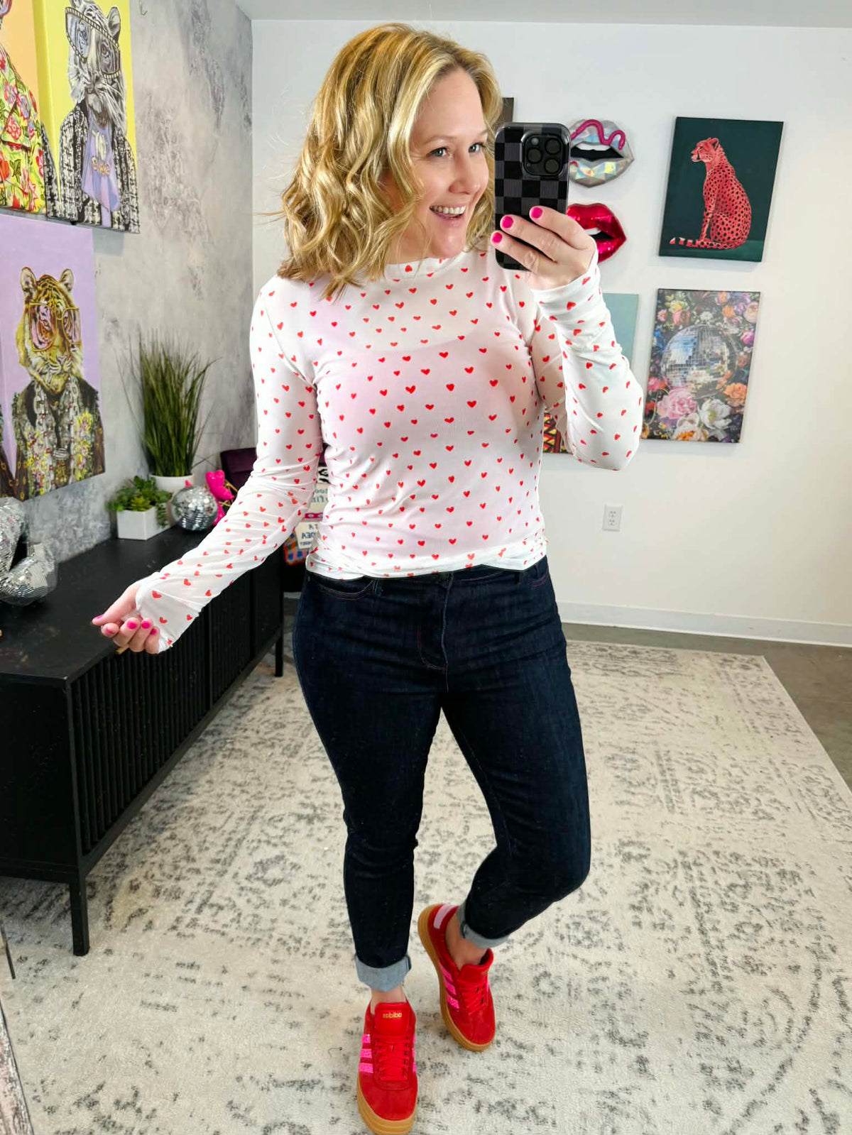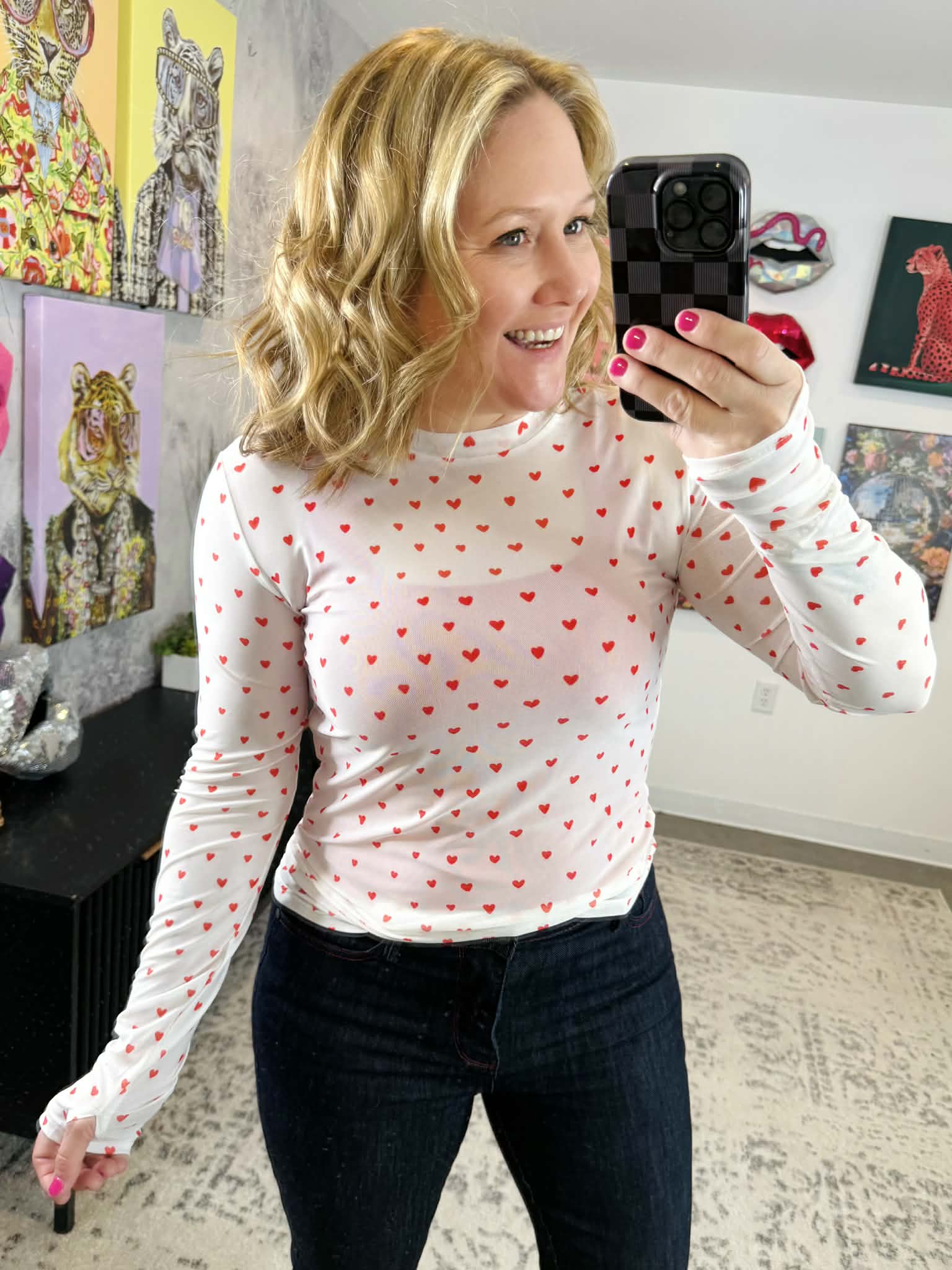 OUR VALENTINES PRINTS ARE HERE!! Super cute for layering, this sultry stretchy mesh print long-sleeve top features a totally sheer design. Perfect worn alone or paired under your favorite cardigan, vest or sweater! Crew neck and thumbhole details.