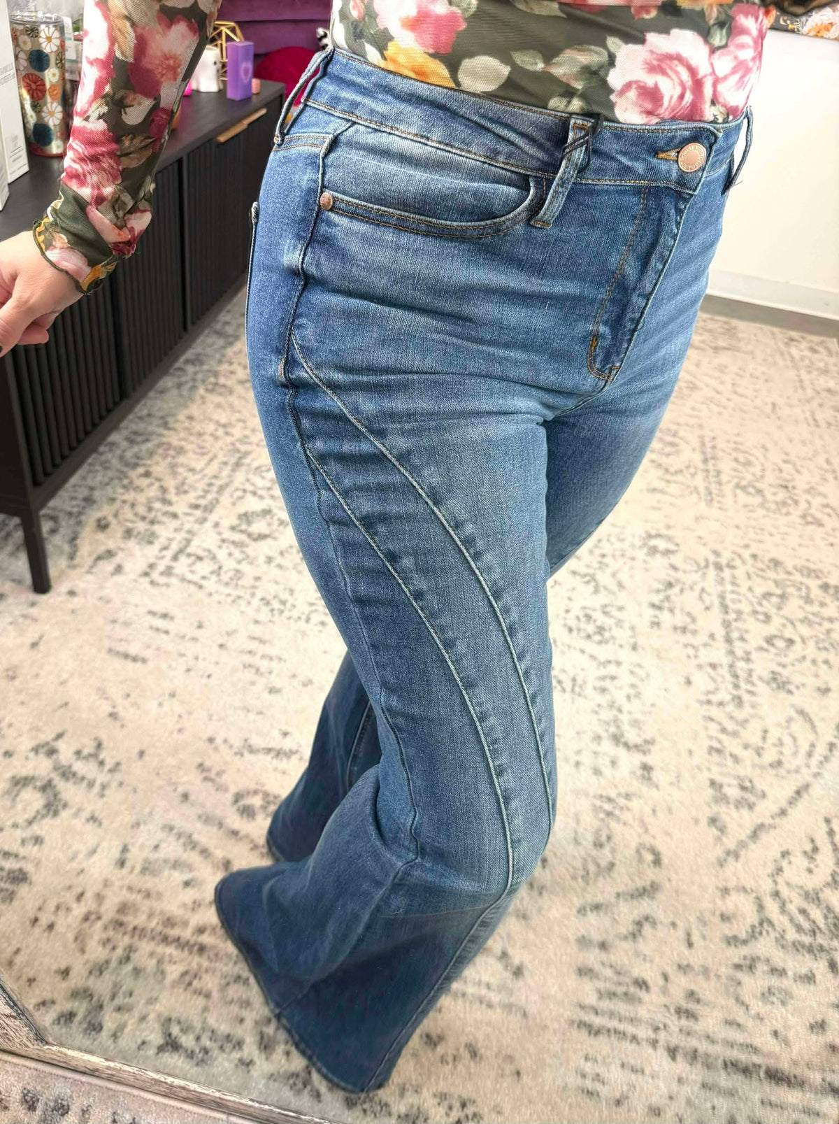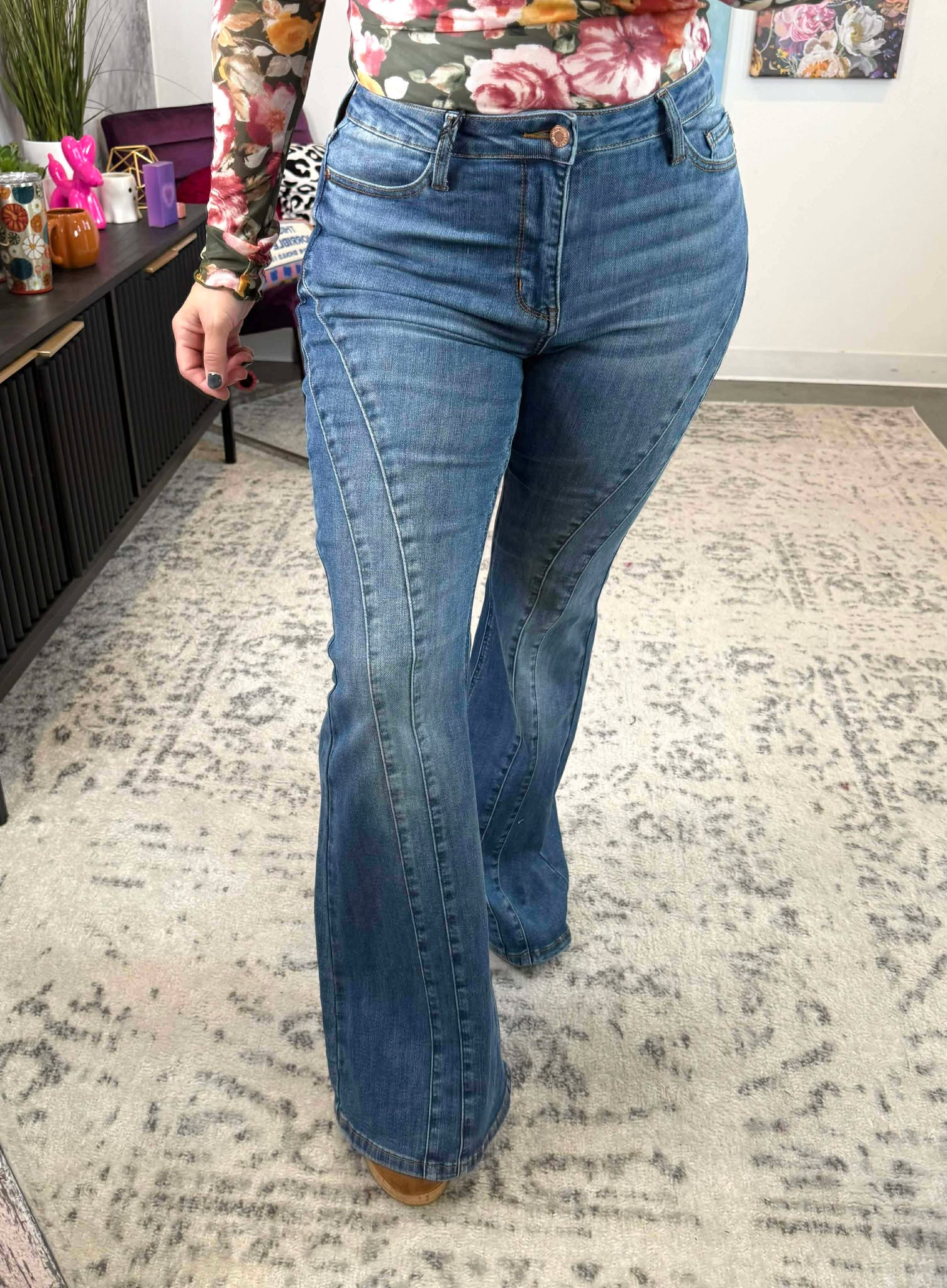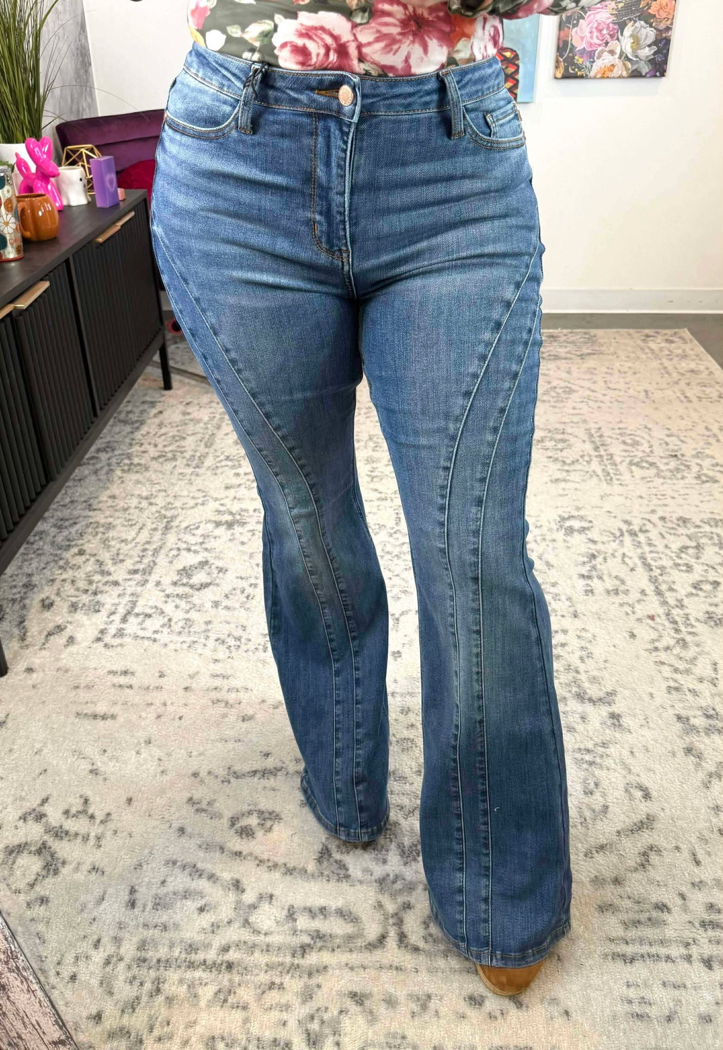 Step into comfort and style with the Judy Blue Twin Stitch Flare Jeans. Featuring a mid-rise fit and a fresh double angular seam detail, these jeans hug your curves while adding a fun twist to your wardrobe. The new flare silhouette brings retro vibes with a modern edge, making them perfect for everything from casual days to spontaneous adventures. Play up your look with these versatile, flattering jeans designed to turn heads and keep you feeling fabulous.
