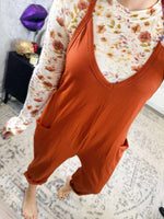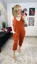 Embrace easygoing style with the Becky Romper in a warm rust shade. Featuring adjustable straps for a perfect fit and a flattering v-neck front, this slouchy romper pairs comfort with convenience thanks to handy pockets. Perfect for sunny days or relaxed nights, it’s your go-to piece for effortless charm from XS to 3X.