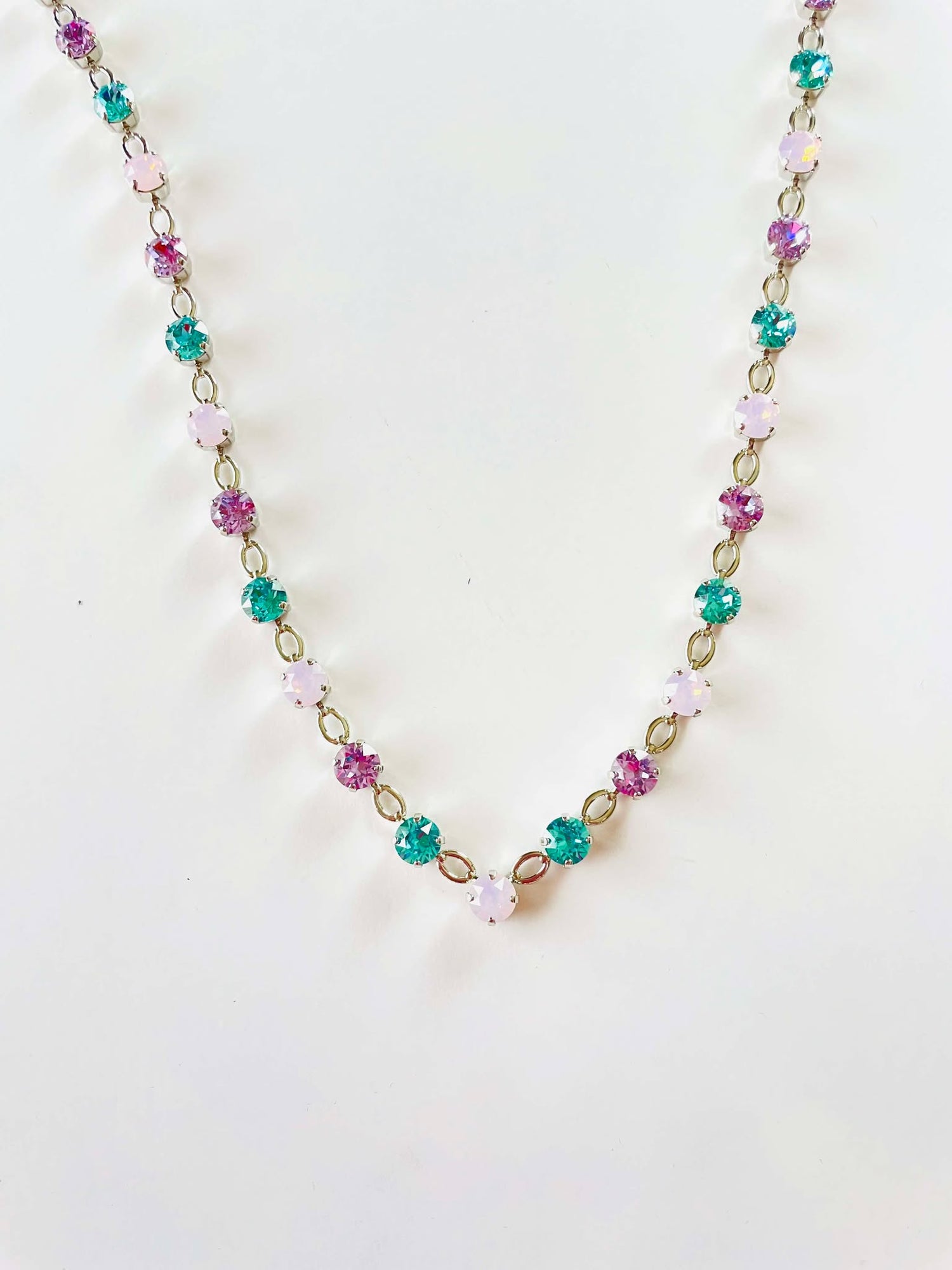 6mm Partial Diamonds Necklace in Rose/Blue Zircon/Amethyst set into Shiny Silver Metal.