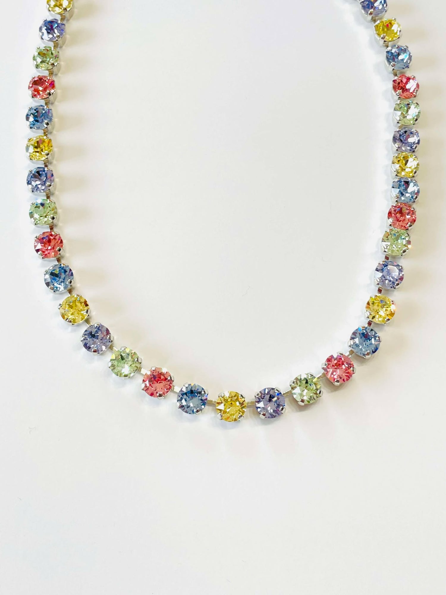 Long Fireball Necklace set into Shiny Silver Metal. Crystals in Light Rose AB, Fuchsia AB, Padparadscha AB, Jonquil AB, Light Turquoise AB, and Violet AB