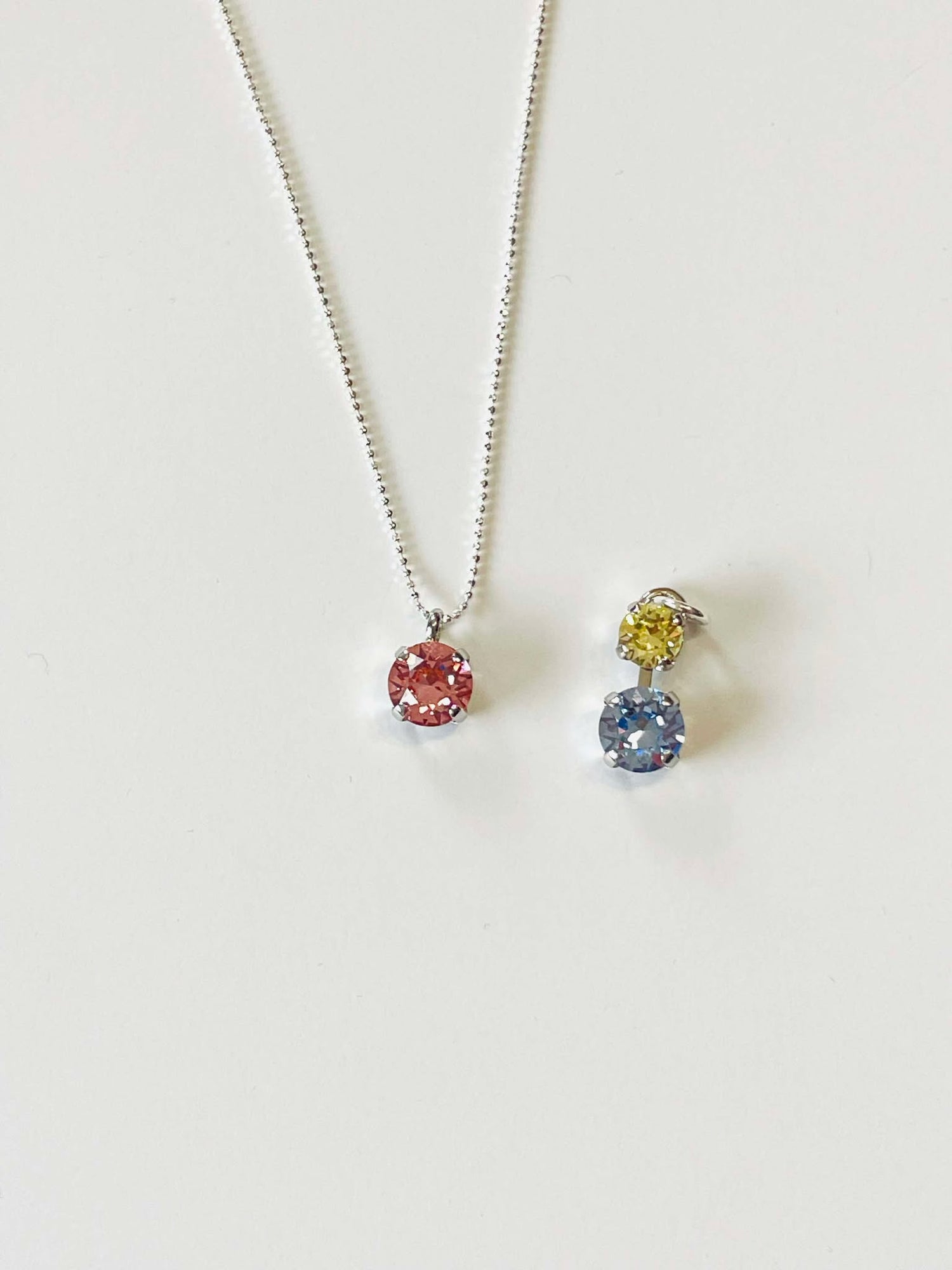 One Pendant is in Light Rose (8mm), and the other is a Double Drop Pendant in Jonquil and Light Sapphire (6/8mm)