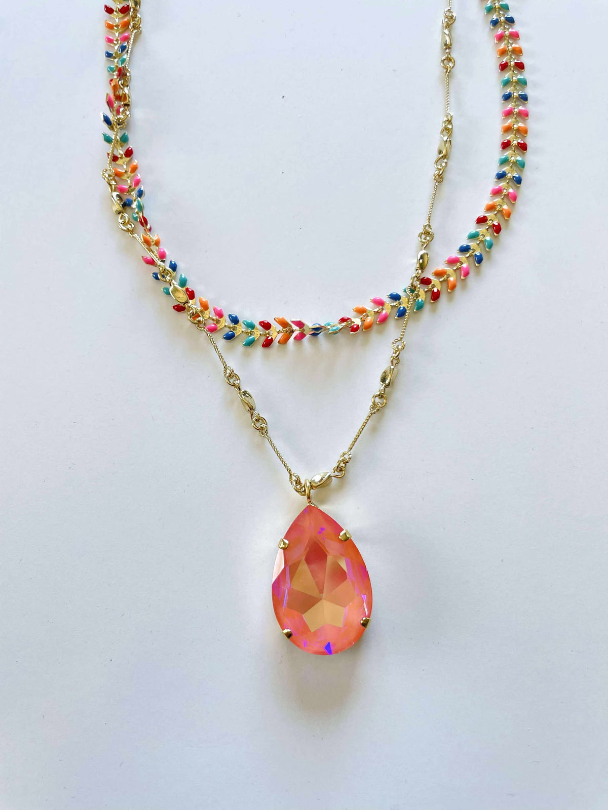 Summer Glow Necklace set into Gold Metal with Large Ultra Orange AB Pear Crystal and Colorful Enamel Chain.