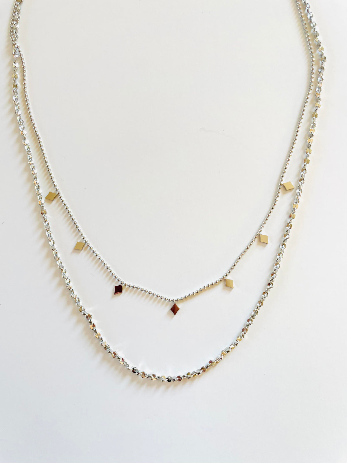 Add some sparkle to your wardrobe with the Twinkling Diamonds Necklace! The double layered design and diamond shaped pendants provide a unique and stylish look. Made with durable stainless steel, this necklace is perfect for everyday wear. Available in gold or silver, it's the perfect accessory to elevate any outfit. And the best part? It's waterproof - so you can show off your bling even on rainy days!