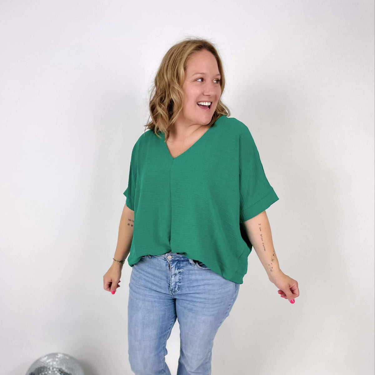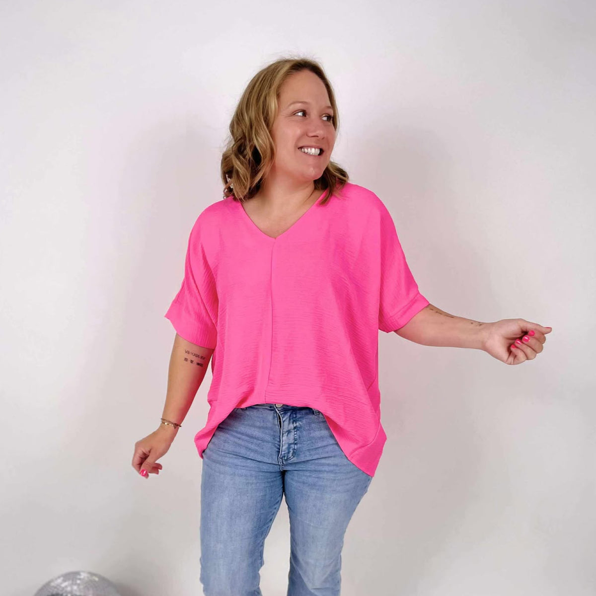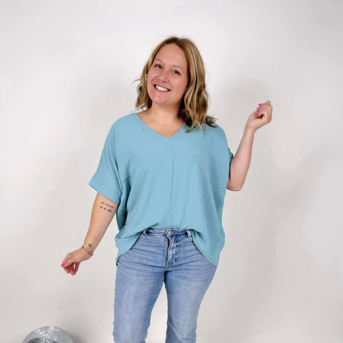 Breeze through your day in the Airloom V-Neck Top! This playful dolman short sleeve design offers a relaxed fit with breathable woven airflow fabric, keeping you cool and comfy. Available in multiple colors and sizes S to 3X, it’s perfect for mixing and matching with your favorite looks. Effortless style meets all-day comfort!