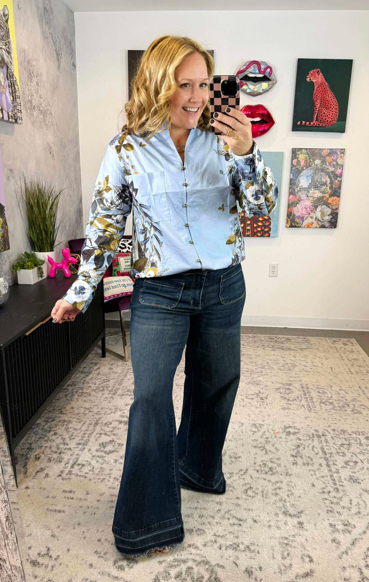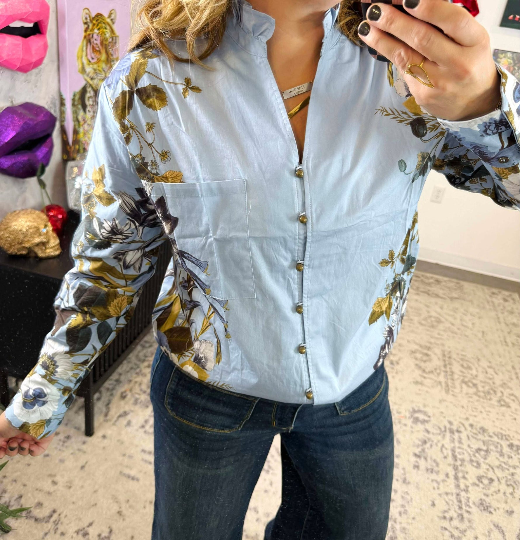 Step into the garden with the Bloomline Blouse! This lightweight, woven top features charming floral accent sleeves and a playful ruffle finish along the V-neck with button closure. Unlined and non-sheer, it offers breezy comfort while keeping your look fresh and flirty. Available in sizes S to 2X, it’s your new go-to for adding a fun floral touch to any outfit.