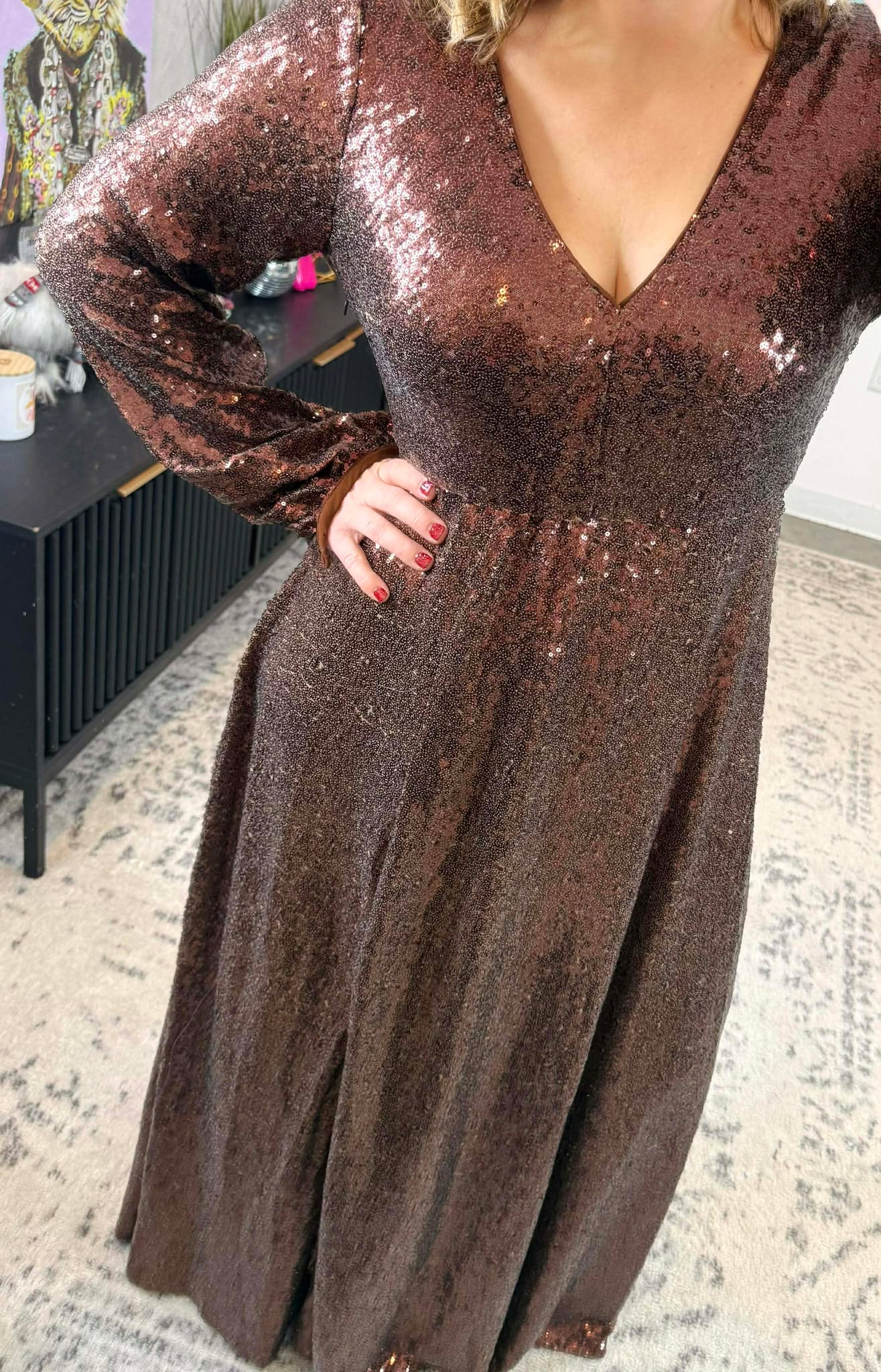 Slip into pure sparkle with the Cocoa Mirage Maxi Dress—a show-stopping sequin stunner that catches every light. This beauty boasts a flirty low v-neckline with chiffon binding, an elastic waistband for comfort, and dramatic voluminous sleeves with cuffed ends. A hidden side zipper, cheeky keyhole back detail, and thigh-high slit keep things interesting, while full lining ensures you're covered in all the right ways. Perfect for turning heads at any occasion.