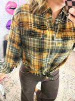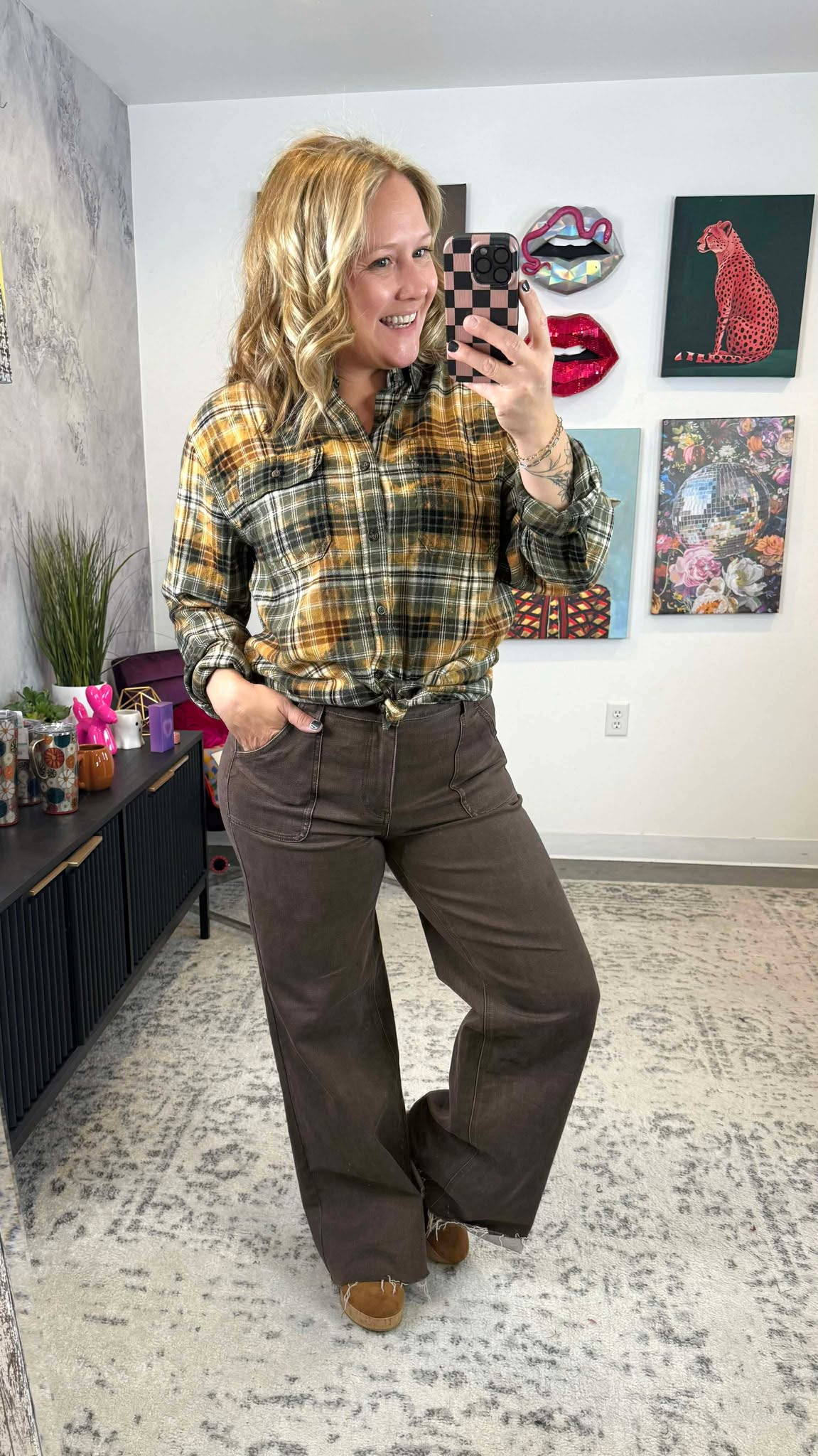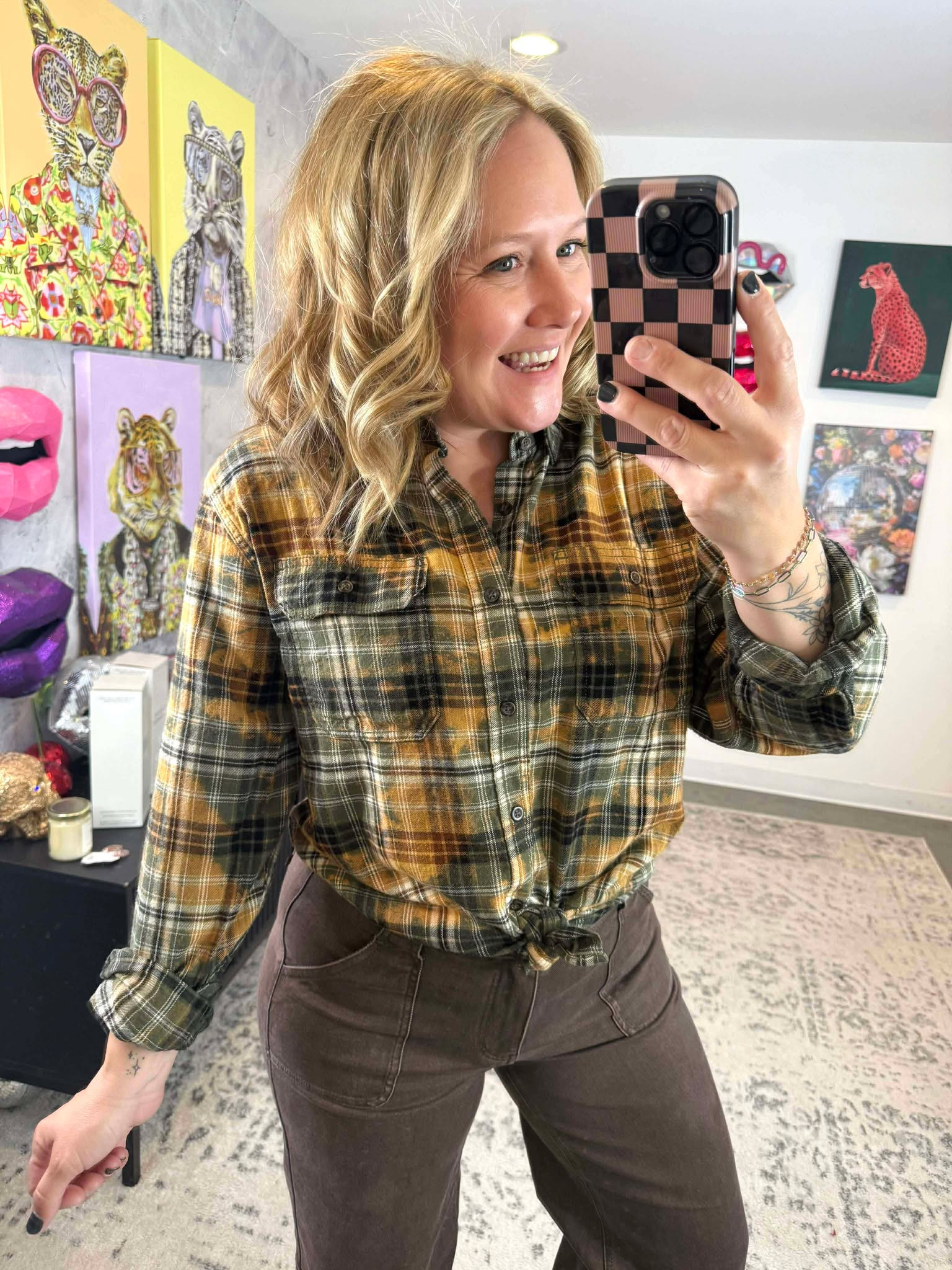 This hand-distressed flannel in Hayride Honey is your new favorite for fall layering. Each piece is uniquely dip-dyed, so no two are exactly alike—just like your style! Perfect for throwing over graphic tees, it adds a cozy, cool vibe to any outfit. Embrace the season with a flannel as playful and versatile as you are.