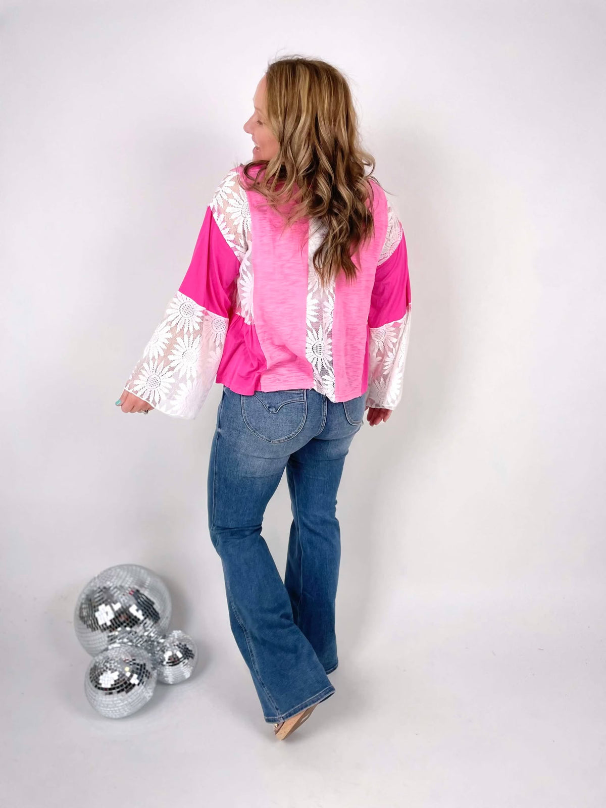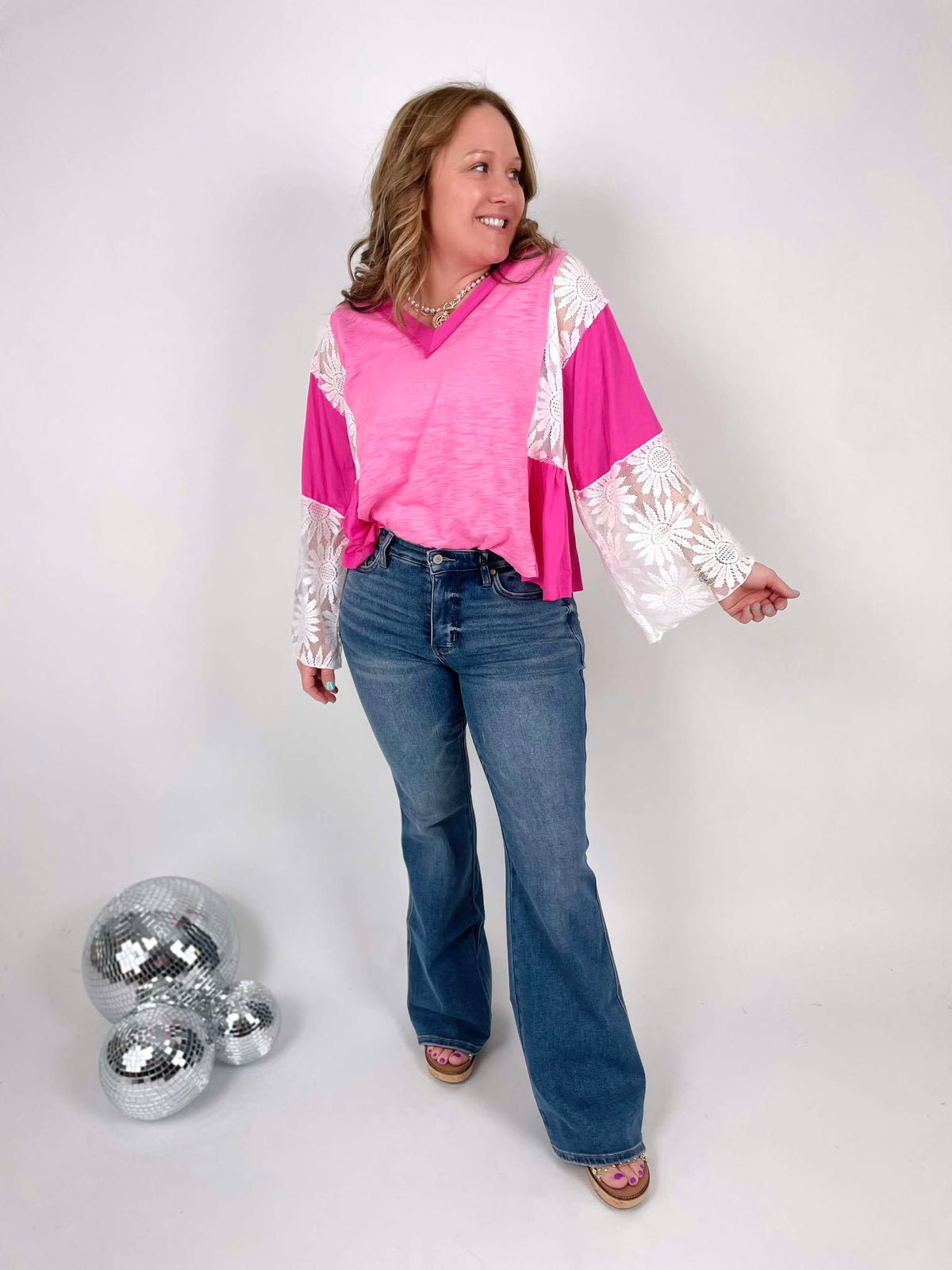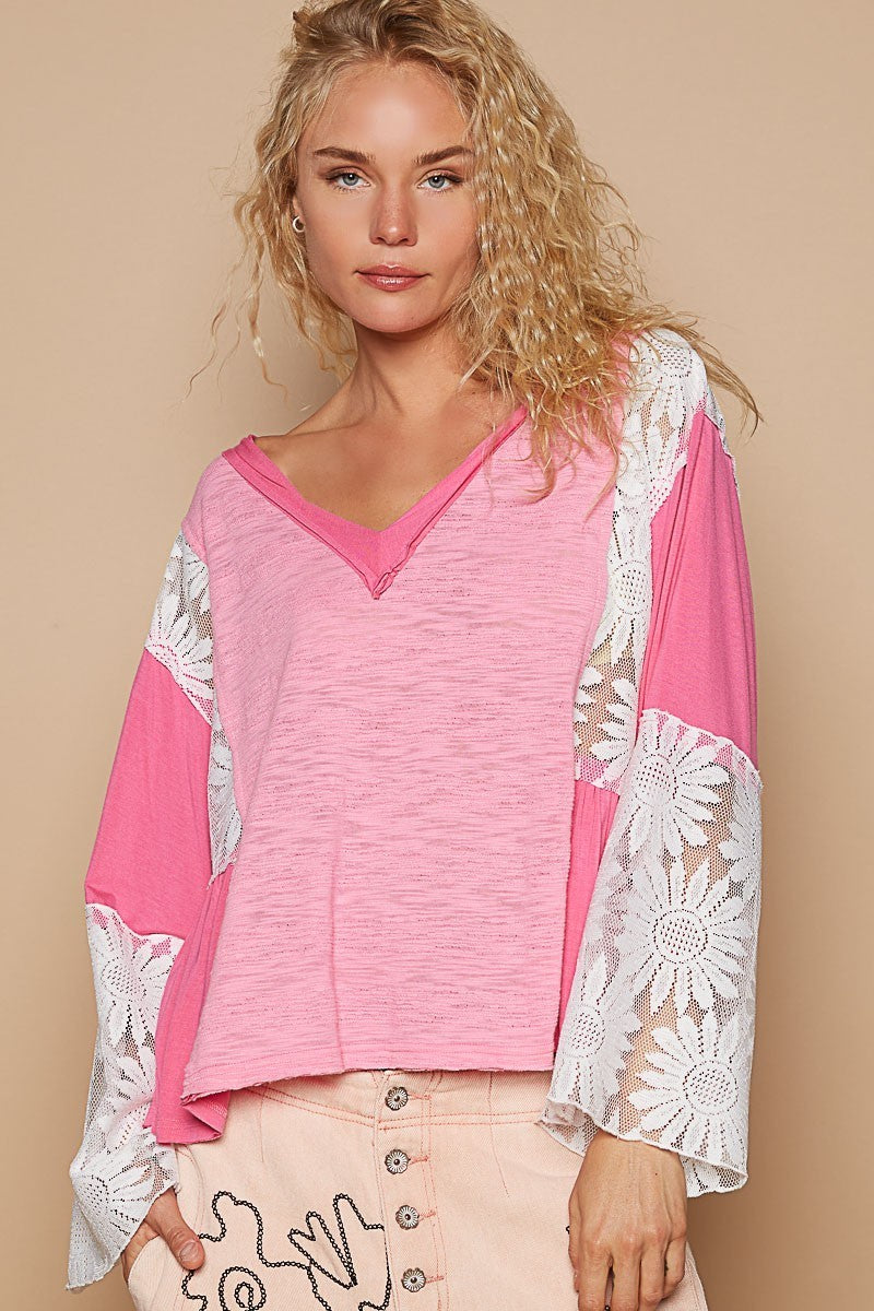 Get ready to charm everyone in our Flared Lace Charm Top! This relaxed-fit top features a flattering V-neck, eye-catching flare sleeves, and a combination of textured slub and POL jersey fabric. With delicate lace detailing and a playful solid pattern, this top is sure to make a statement. Time to lace up and rock your unique style!