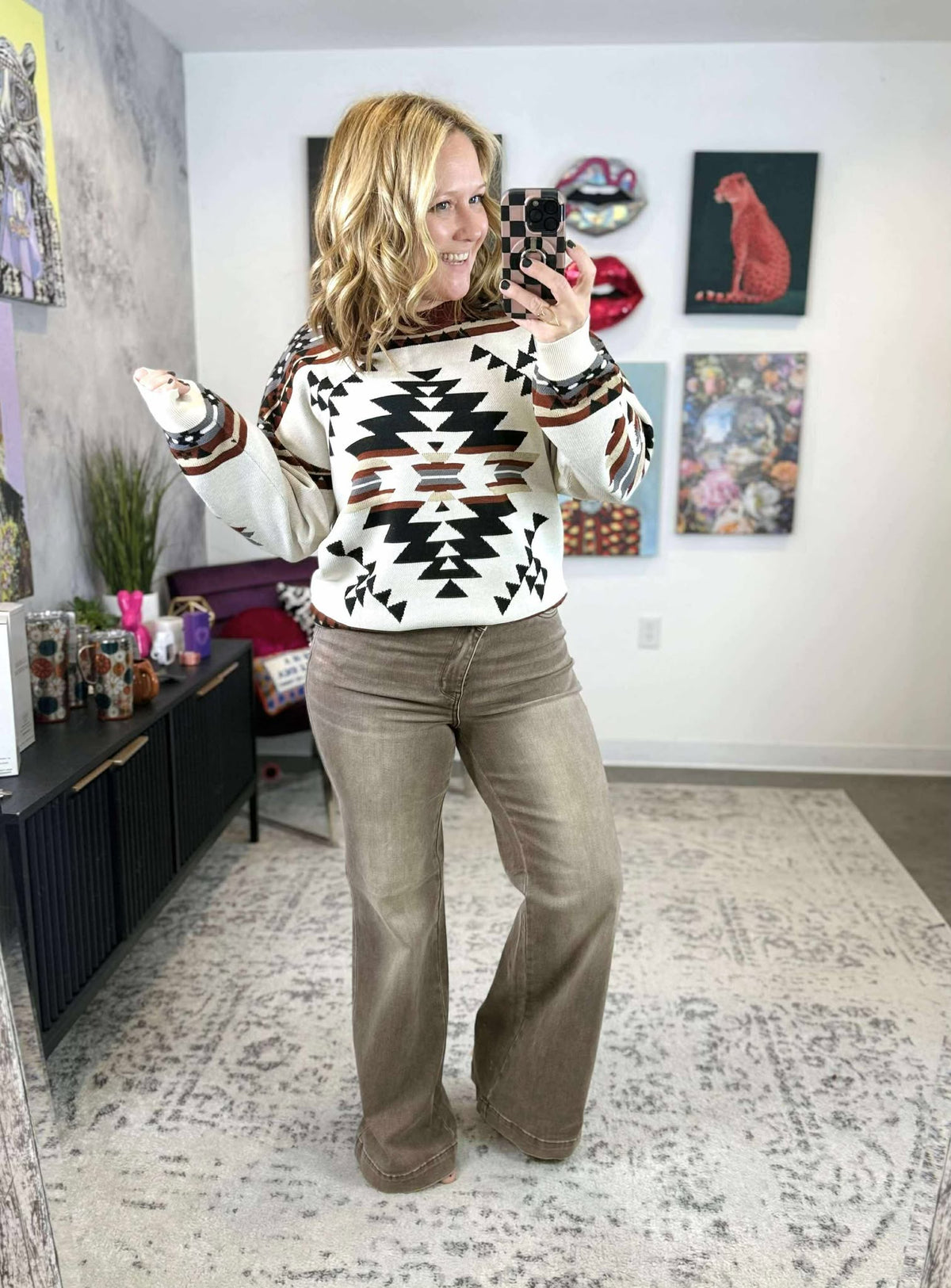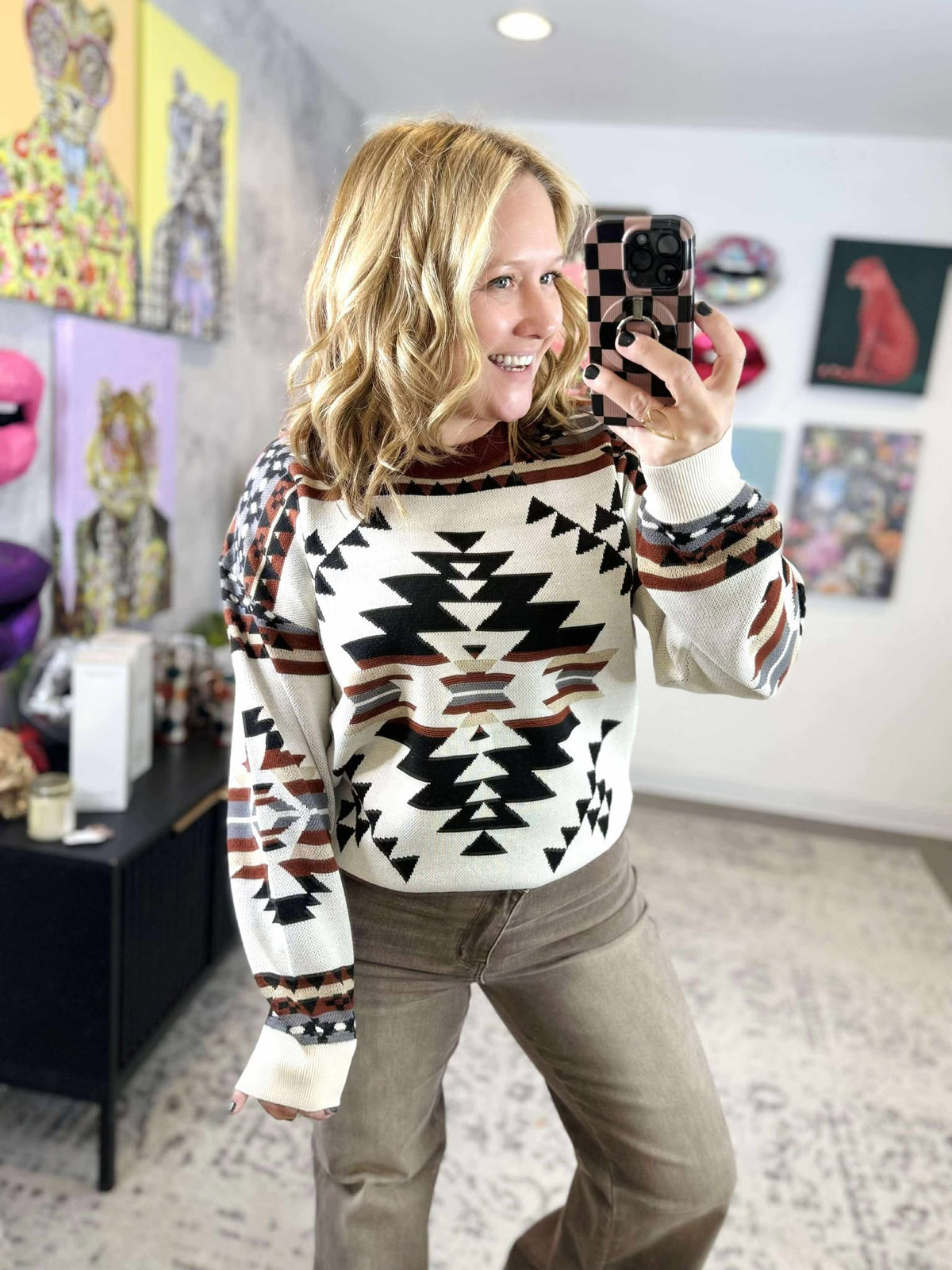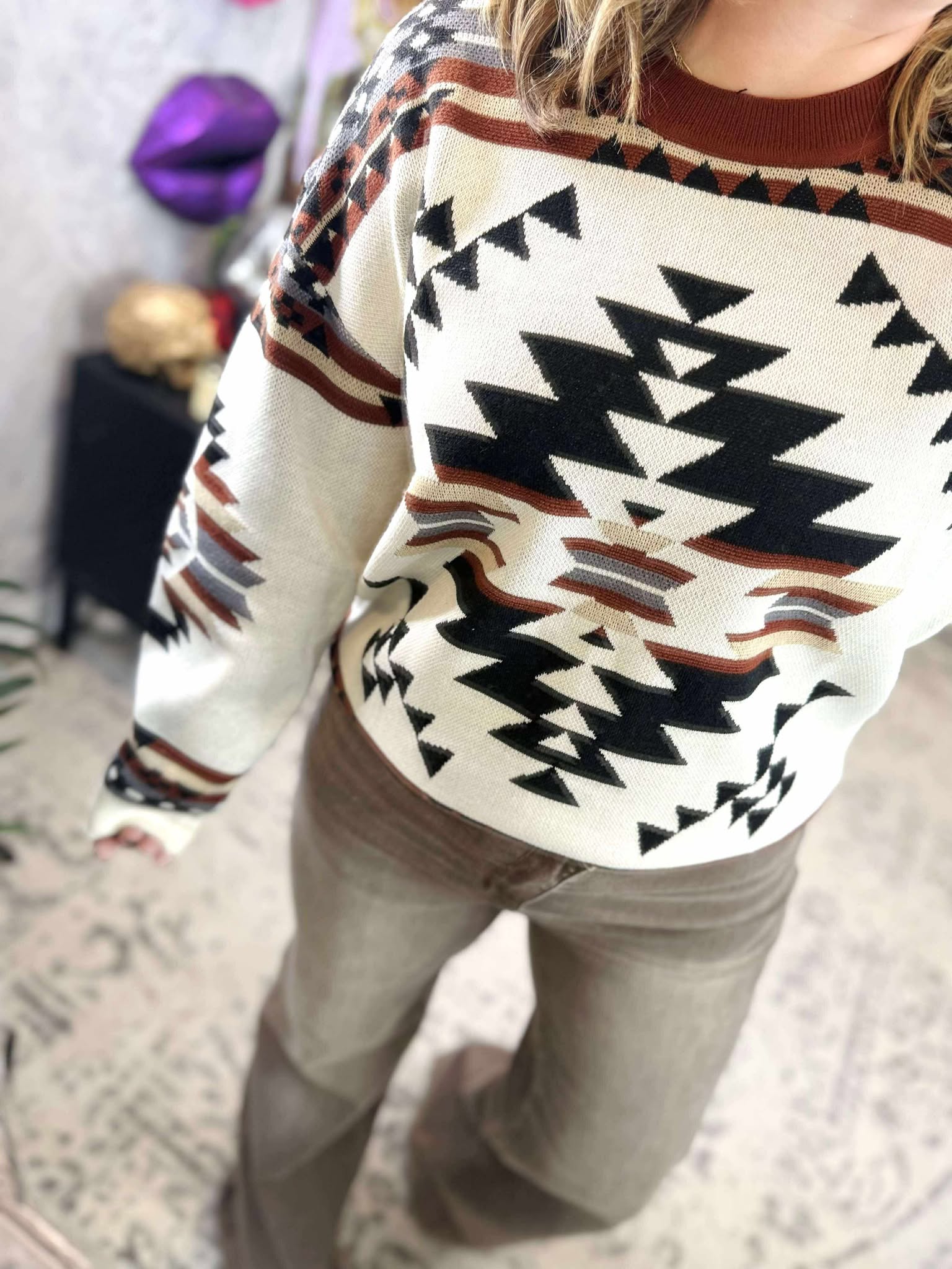 Cozy up and stand out in our Lean On Me Knit Sweater, featuring an eye-catching Aztec print. Perfect for colder weather, this sweater will keep you both warm and stylish. Don't lean on anyone else, this sweater has got you covered!