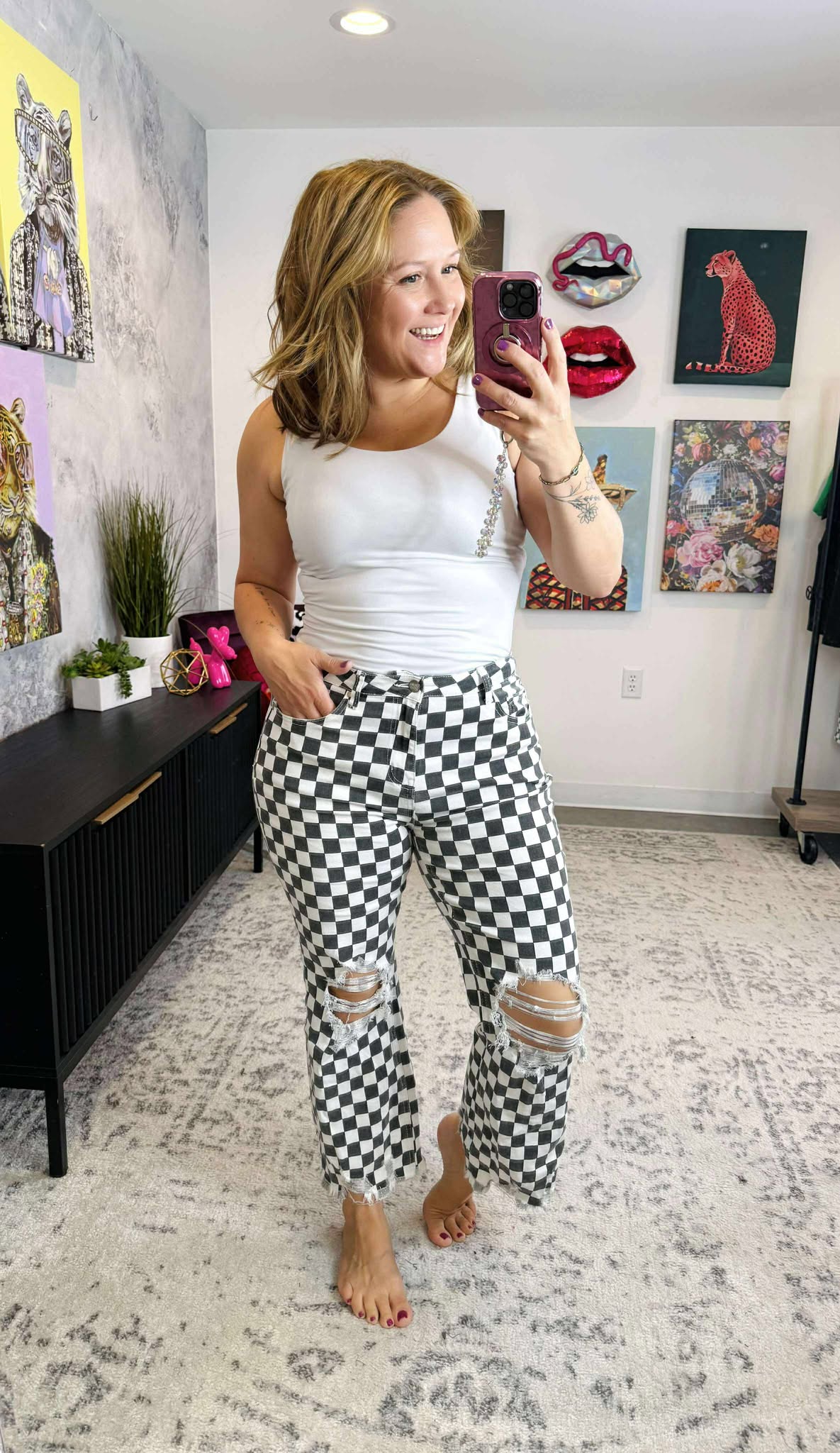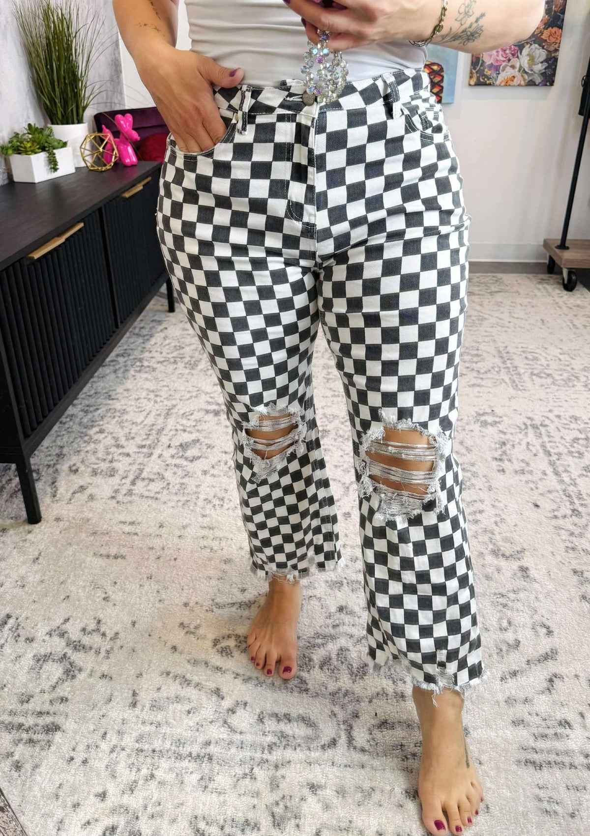 Stand out effortlessly with the Round The Track Jeans, featuring a distinctive faded black and white checkered pattern and stylish distressed holes at the knees. Designed to combine bold fashion with comfort, these jeans are the perfect choice to upgrade your wardrobe and showcase your confident, trend-savvy side.