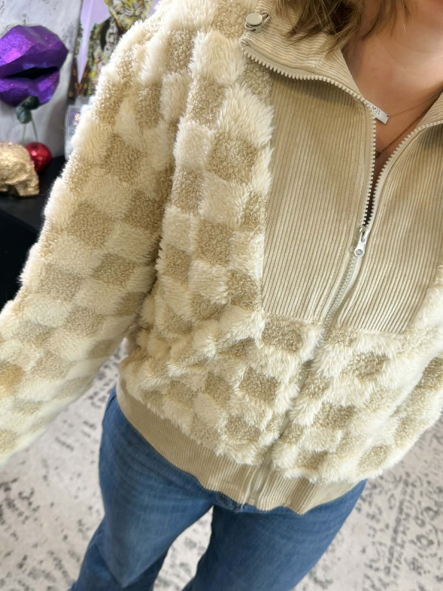 Stay cozy and stylish with our Cozy Checker Sherpa Jacket. Featuring a delightful corduroy contrast, this jacket is perfect for any chilly day. The fuzzy sherpa lining will keep you warm while the zip-up design and pockets add convenience. Don't sacrifice comfort for fashion - get the best of both with our jacket!