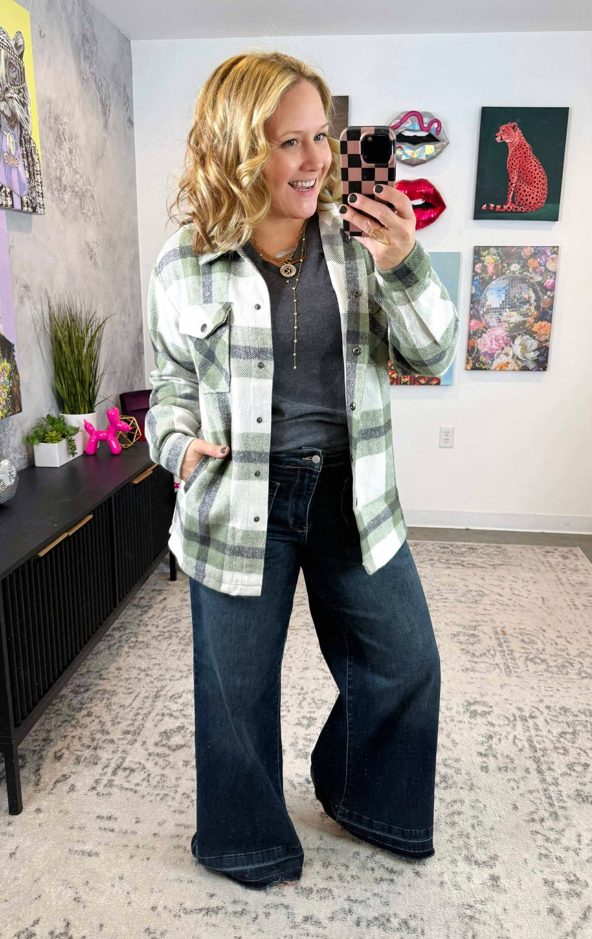 The Norah Plaid Shacket in Sage is a versatile addition to any wardrobe. Featuring a mix of soft, green colors, this shacket is perfect for creating a chic and understated look. It has features of a straighter bottom hem, snap buttons that are functioning and the two front upper pockets are fold over, functioning pockets with a snap button! The cozy fabric and relaxed fit make it ideal for layering, providing warmth and style in cooler weather.