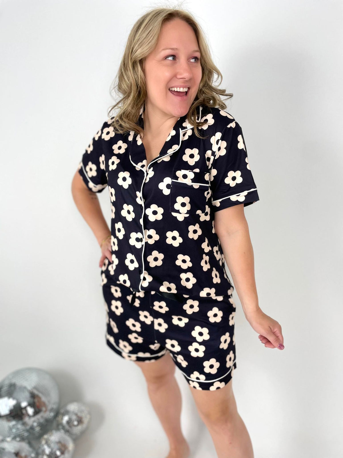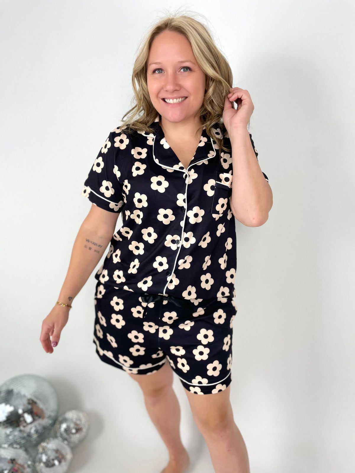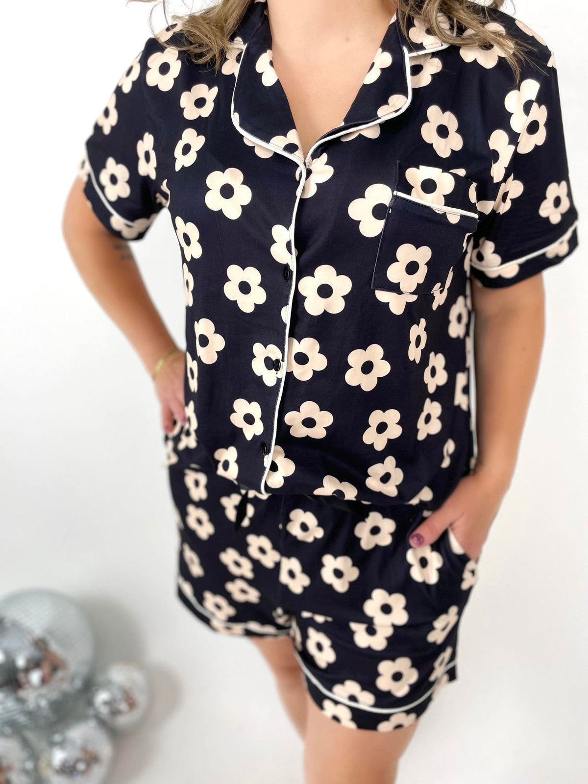Get cozy in our Daisy Pajama Set! Made with super soft fabric, this set features a functional button-down collared top with pocket and comfy elastic waist shorts with pockets too. Plus, add a touch of luxury with the satin drawstring. Relax in style and comfort with these playful pajamas. (Perfect for lazy Sundays and Netflix binges!)
