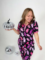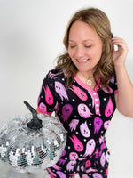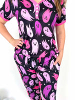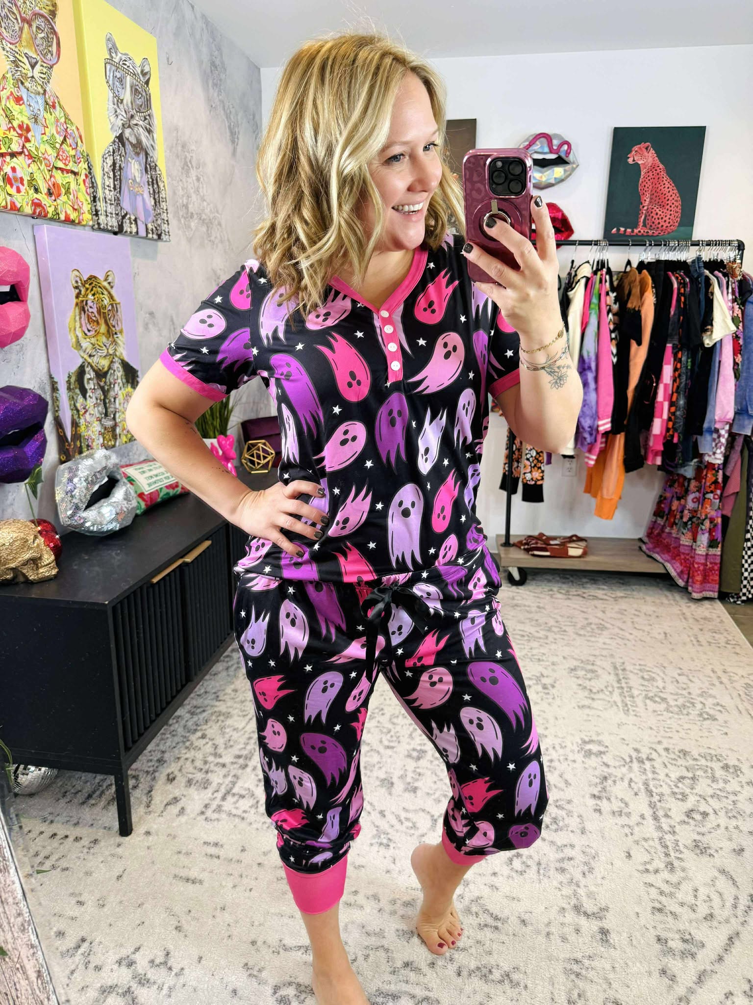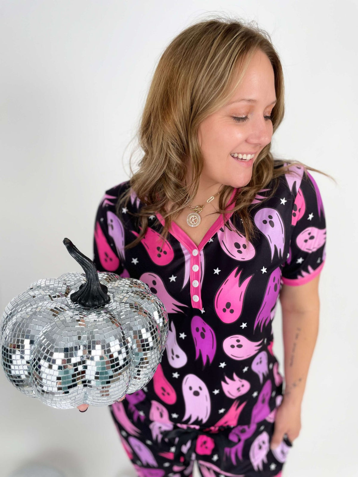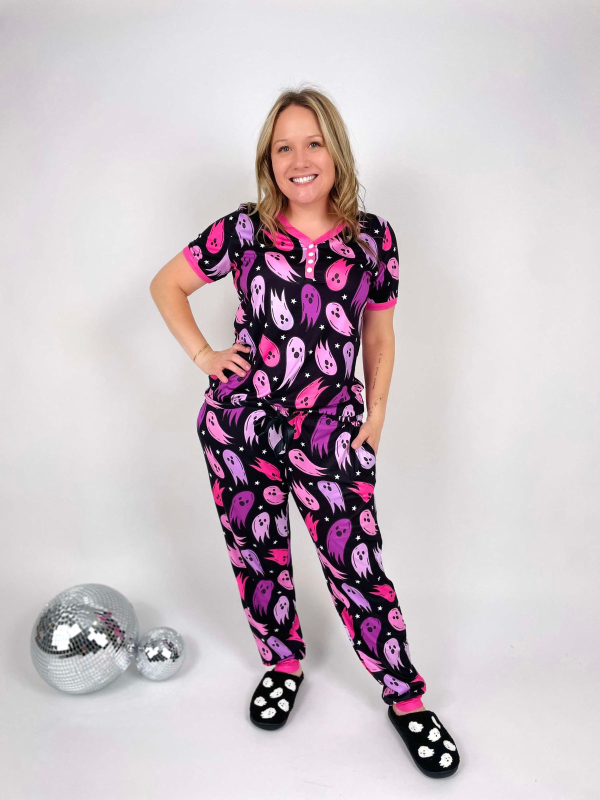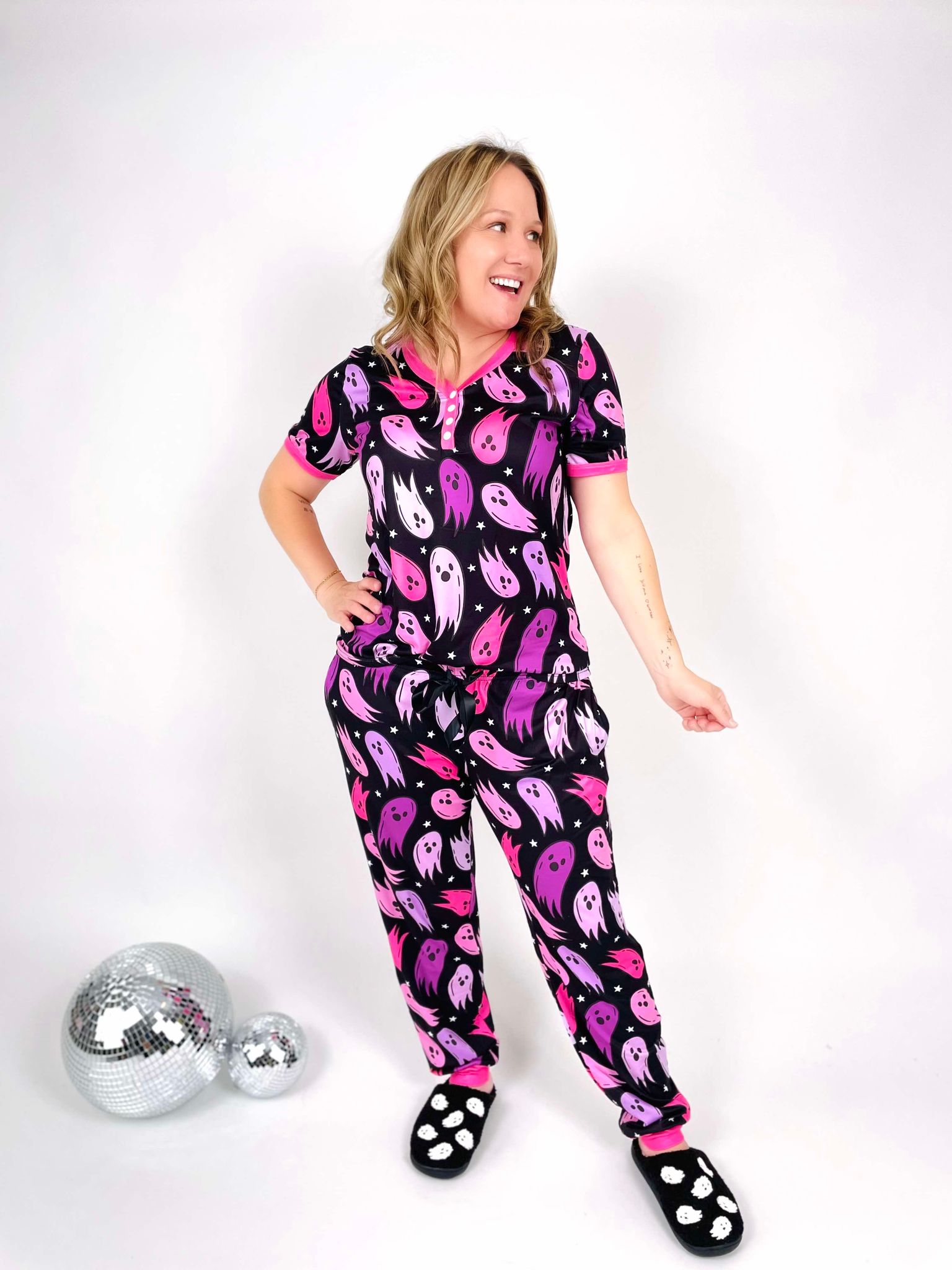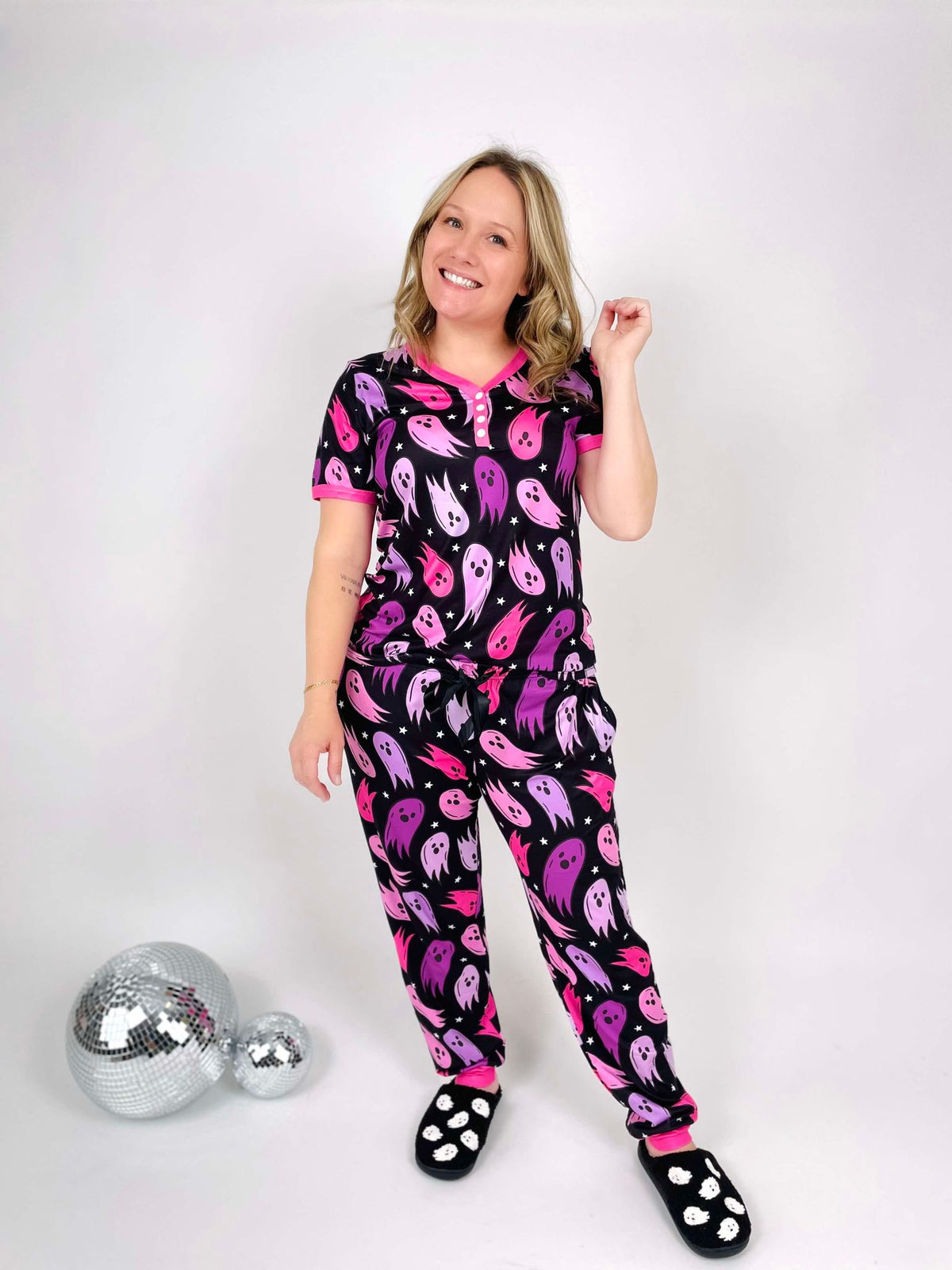 Get ready to snuggle up in these buttery soft pajamas featuring a playful ghost print! Made for a cozy night in, these pajamas are perfect for adding some quirky fun to your sleepwear collection. Say goodbye to boring pajamas and hello to spooky style with this ghostly set!