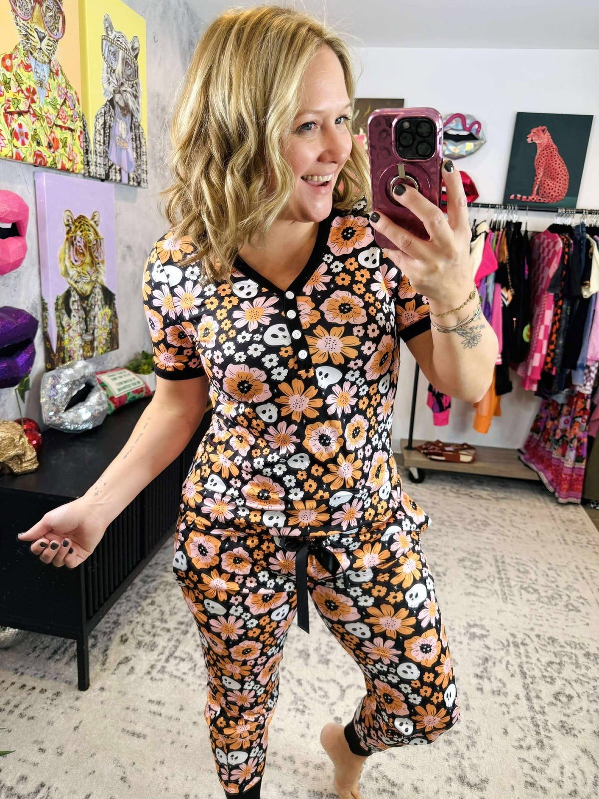 Drift into dreamland with this playful pajama set featuring a unique orange floral and skull print. Crafted from buttery soft fabric, it promises all-night comfort while keeping your style delightfully edgy. The short sleeves add a breezy touch, perfect for cozy nights or lazy mornings. Embrace cozy with a bit of mischief!