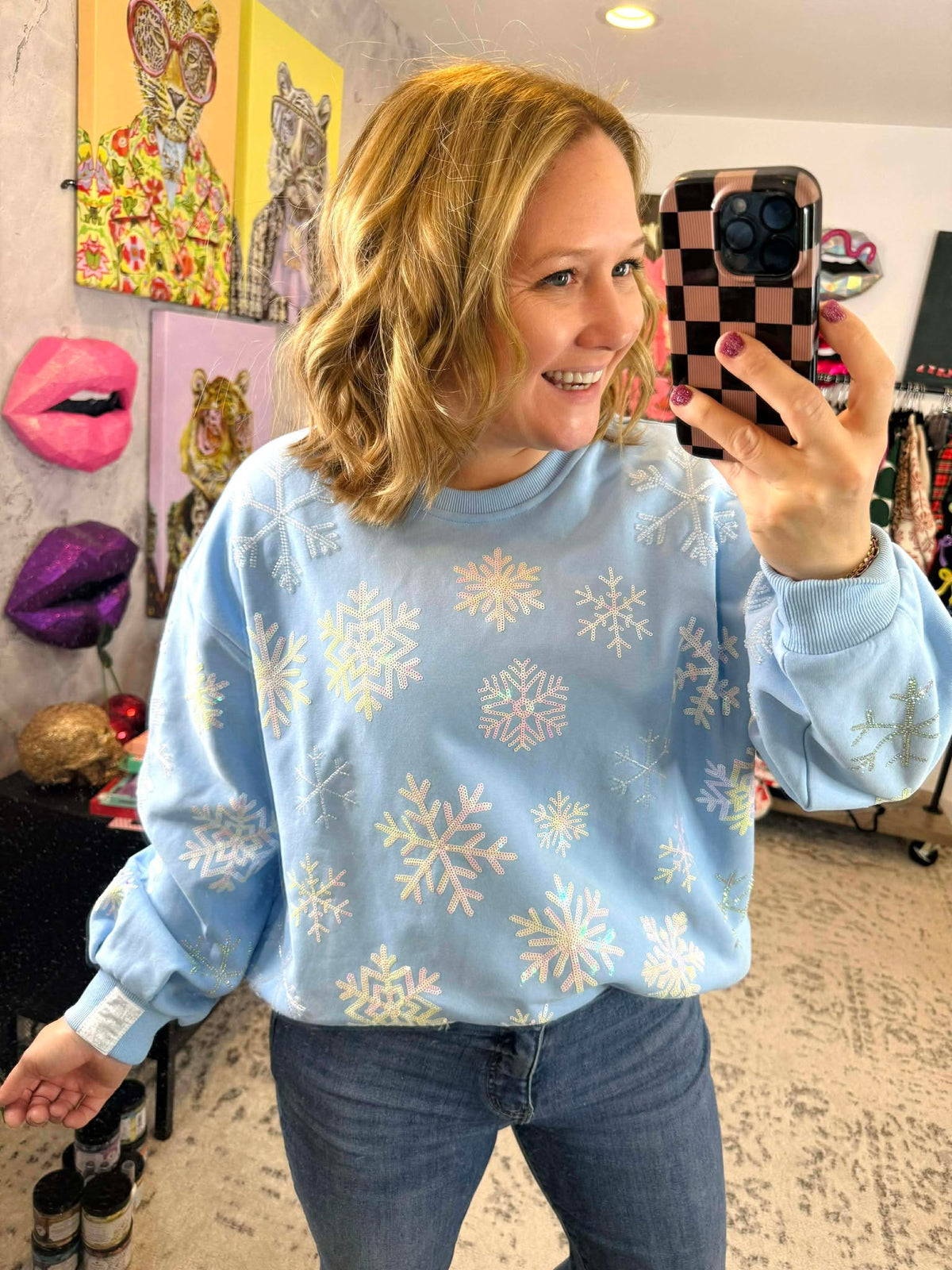 Embrace your inner winter royalty with this dazzling blue iridescent snowflake sweatshirt! Adorned with shimmering sequin snowflake details, this cozy layer transforms everyday style into something truly magical. The iridescent finish catches the light beautifully, creating an enchanting sparkle effect that's perfect for holiday celebrations or adding a touch of glam to casual outfits. Available in sizes XS-XL, it's your ticket to looking absolutely fabulous all season long.