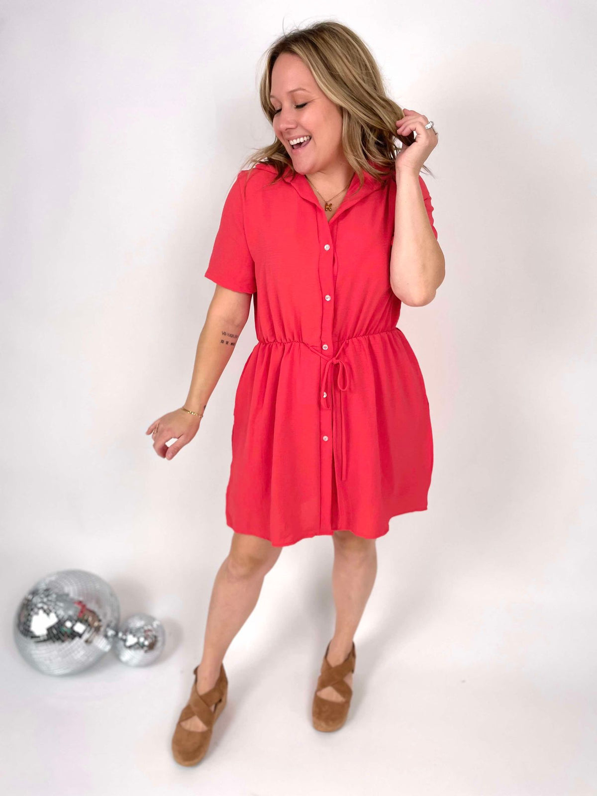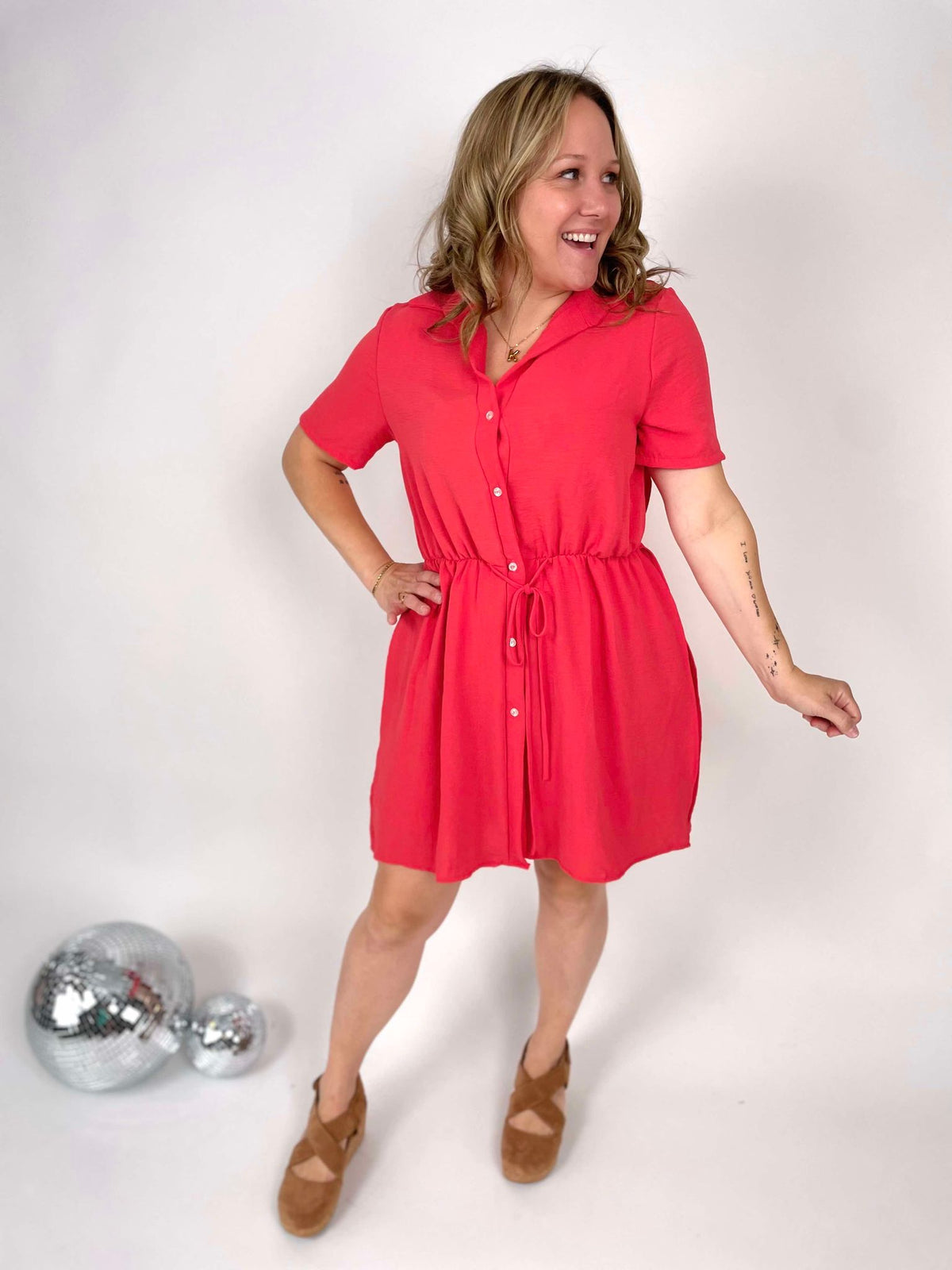 Get ready to turn heads in our Flirty Romper Dress! This short-sleeve, button-up romper is the perfect mix of playful and stylish. Made of non-wrinkle fabric, it has an elastic waist, waist strings for a tighter fit, functional buttons, and pockets on the shorts. Make a statement and stand out from the crowd in this unique and striking piece!