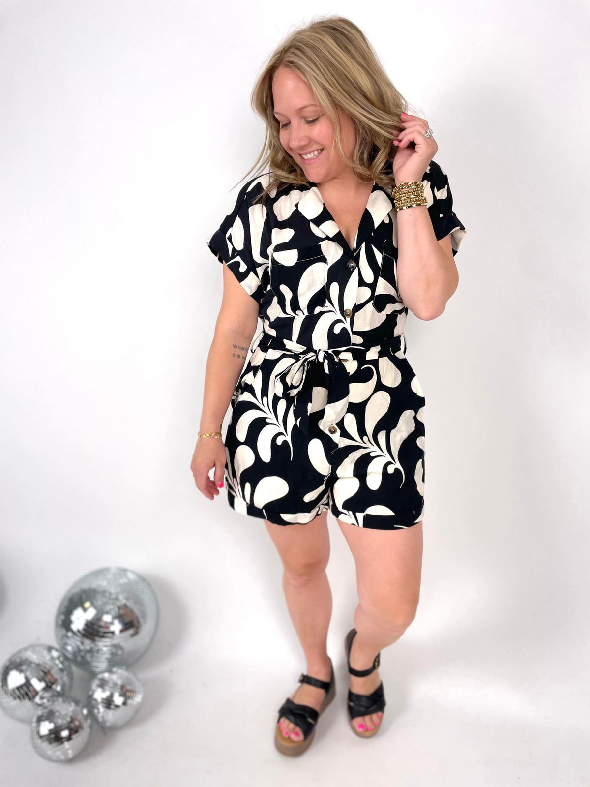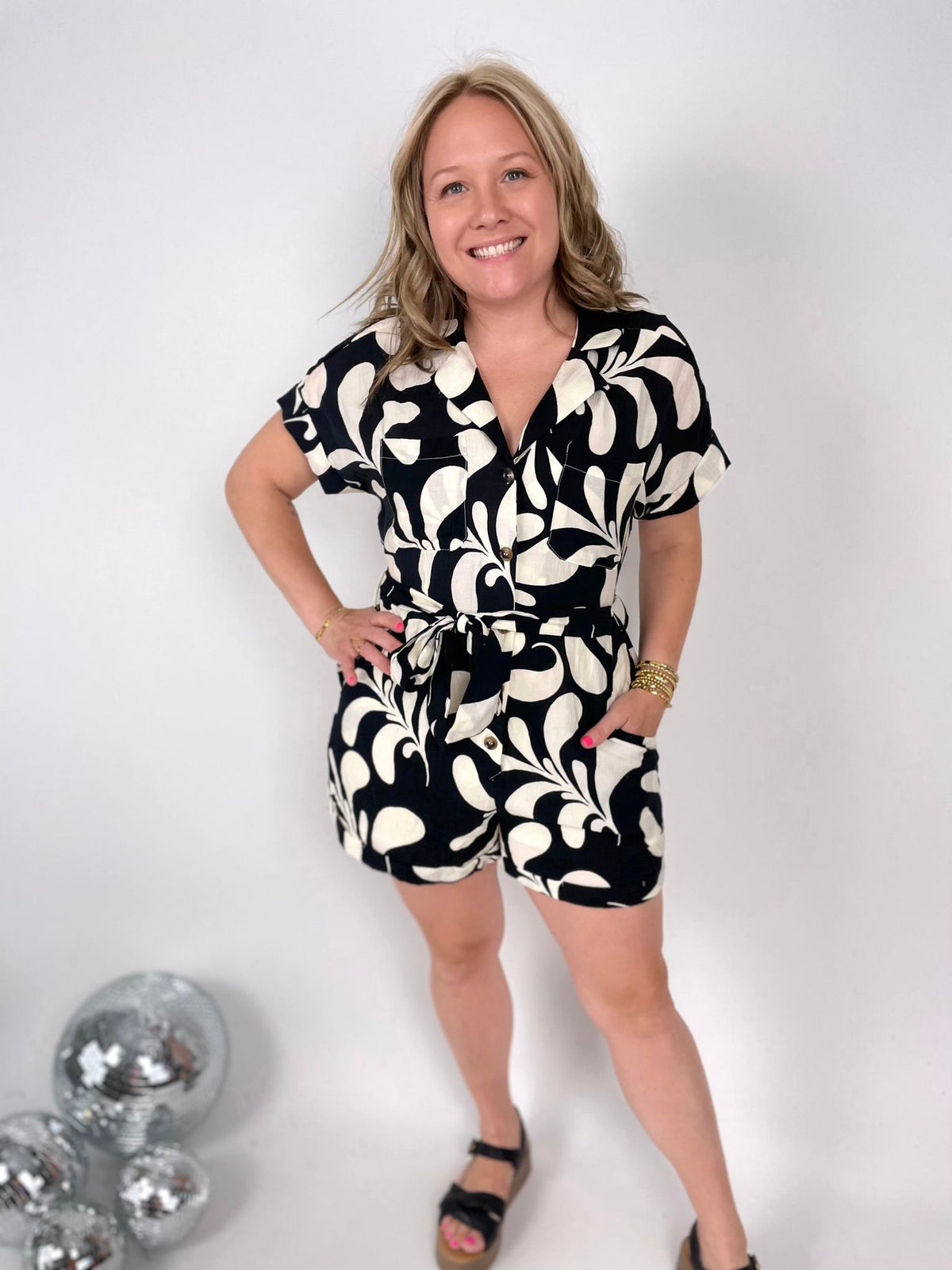 Get ready to make a stylish statement with our Leafy Luxe Romper! Featuring a playful leaf print and v-neckline, this short-sleeved romper is perfect for any occasion. It also includes a waist tie for added flair, as well as pockets and a lightweight lining for practicality. Don't miss out on this non-sheer, woven piece - it's a must-have for your wardrobe!