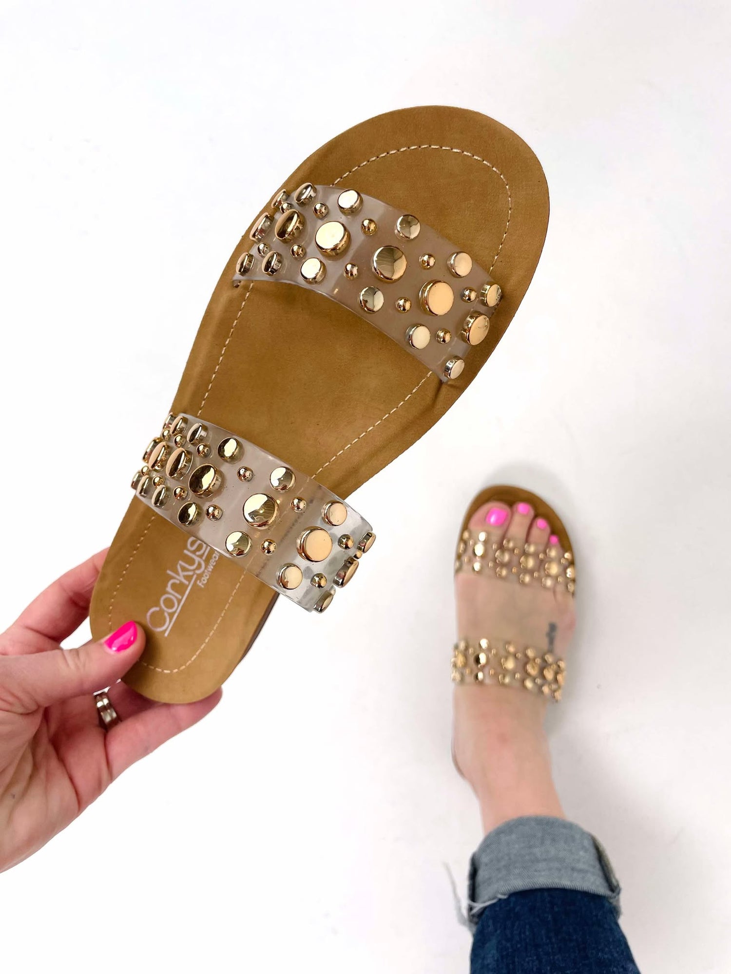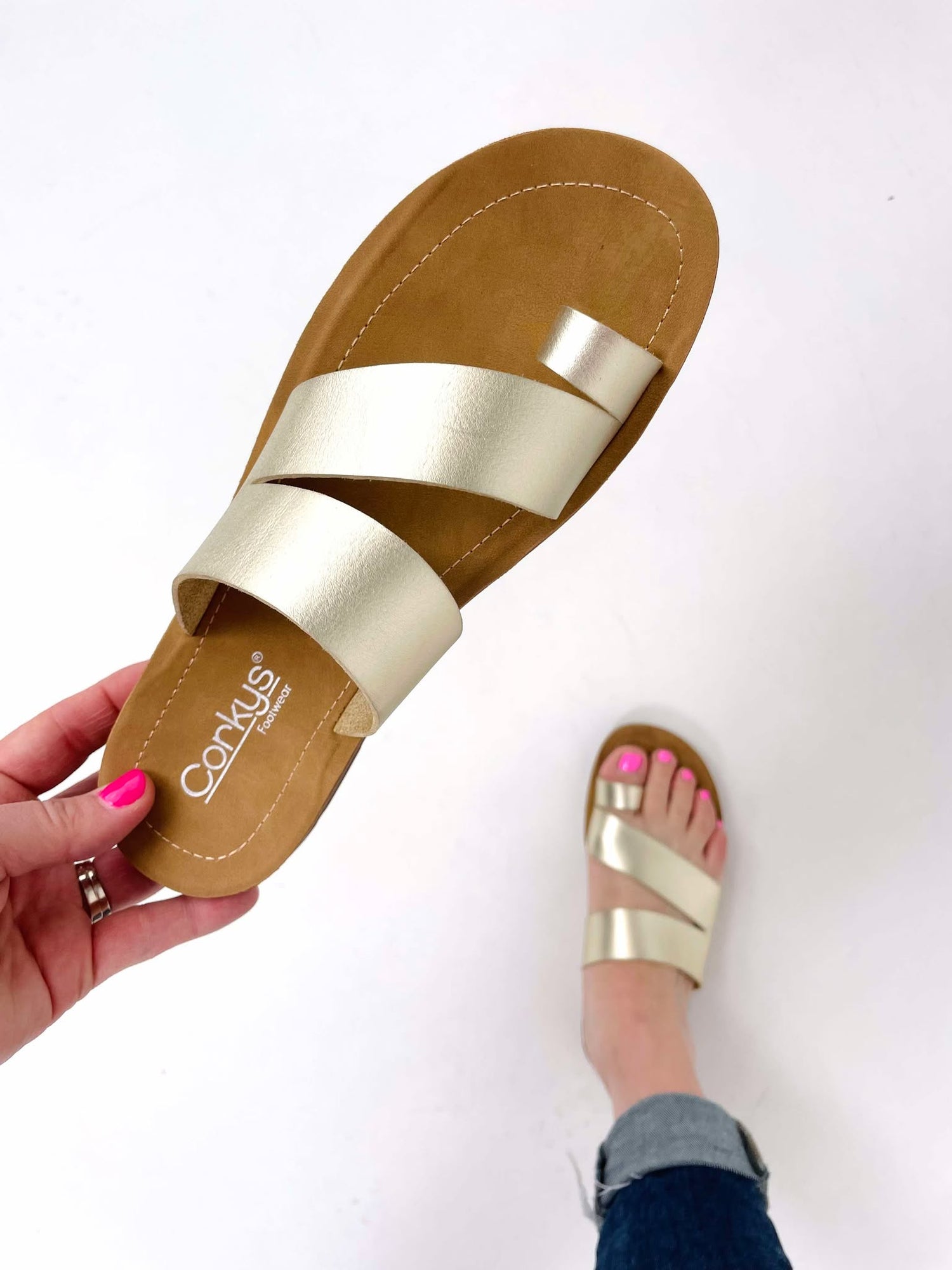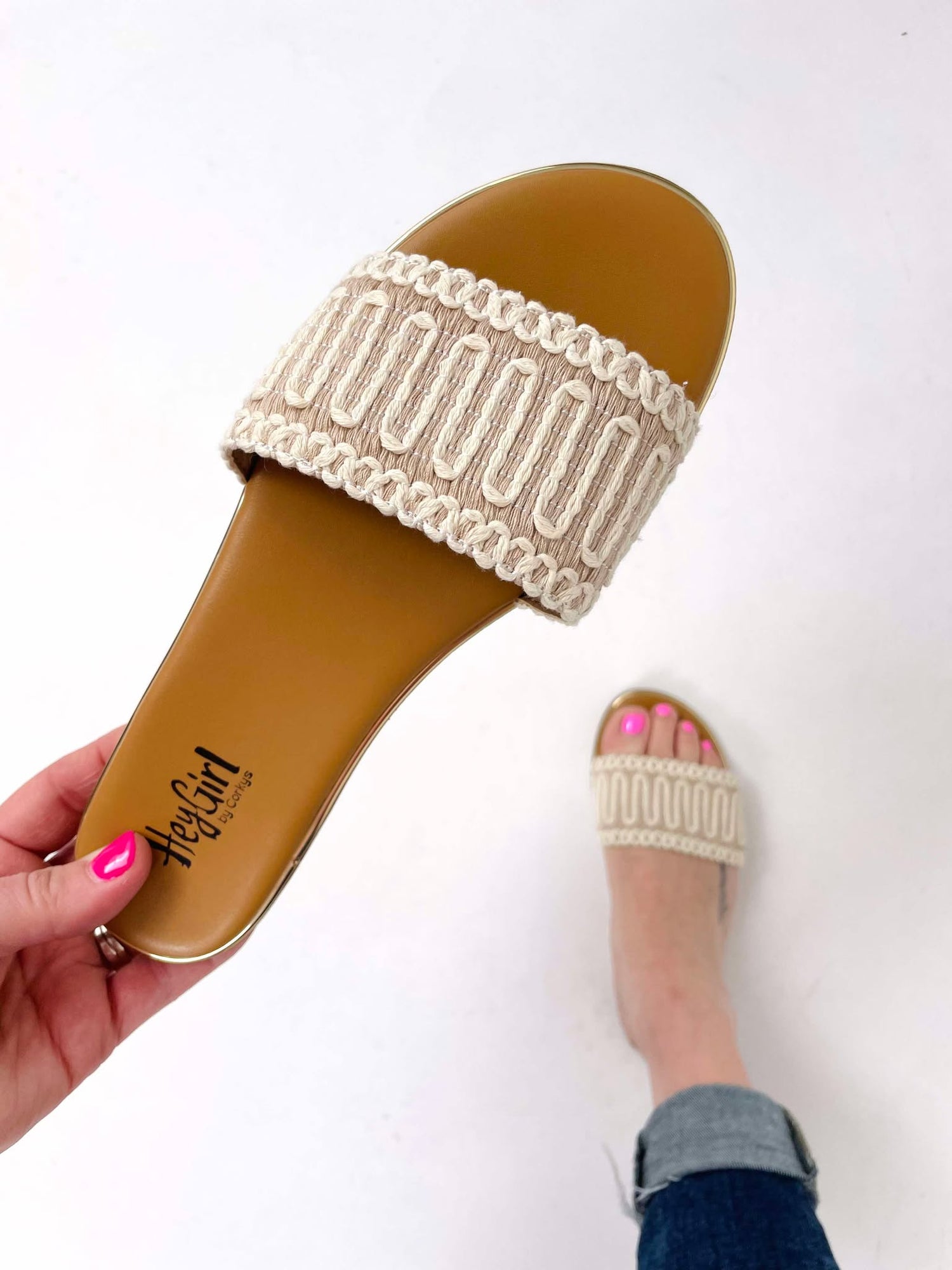 Introducing "JUST A FLING" - the strappy slide on sandal design that will make you feel like you're walking on clouds. Perfect for a day of fun and adventure, these sandals offer both style and comfort in one. Give your feet the treat they deserve with Corkys.