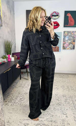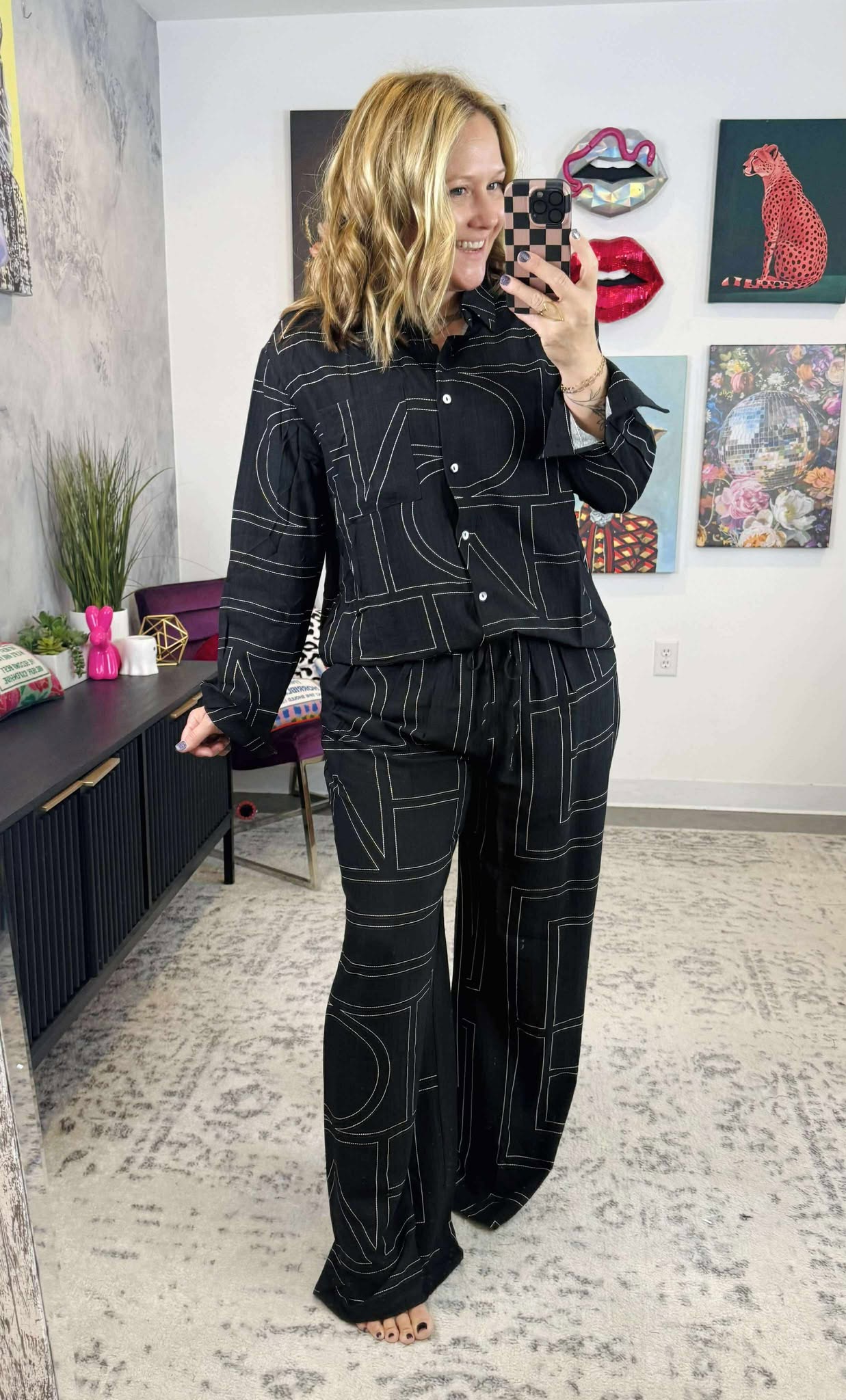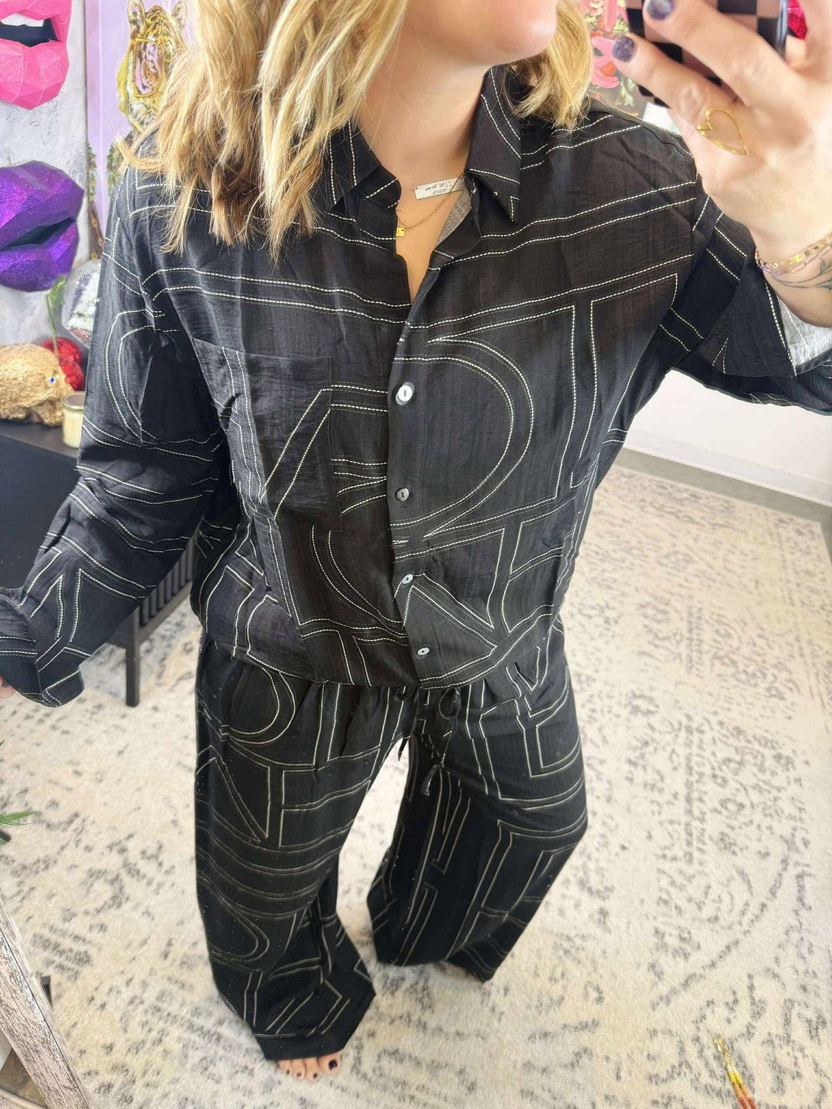 This playful outfit features a long sleeve top with buttons, a classic collar, and a handy chest pocket. The wide-leg pants come with an elastic waistband and drawstring for a comfy fit, plus side pockets for convenience. Covered in a fun geometric pattern, this set adds a lively touch to your wardrobe while keeping you stylish and comfortable from head to toe. Available in sizes S to L.