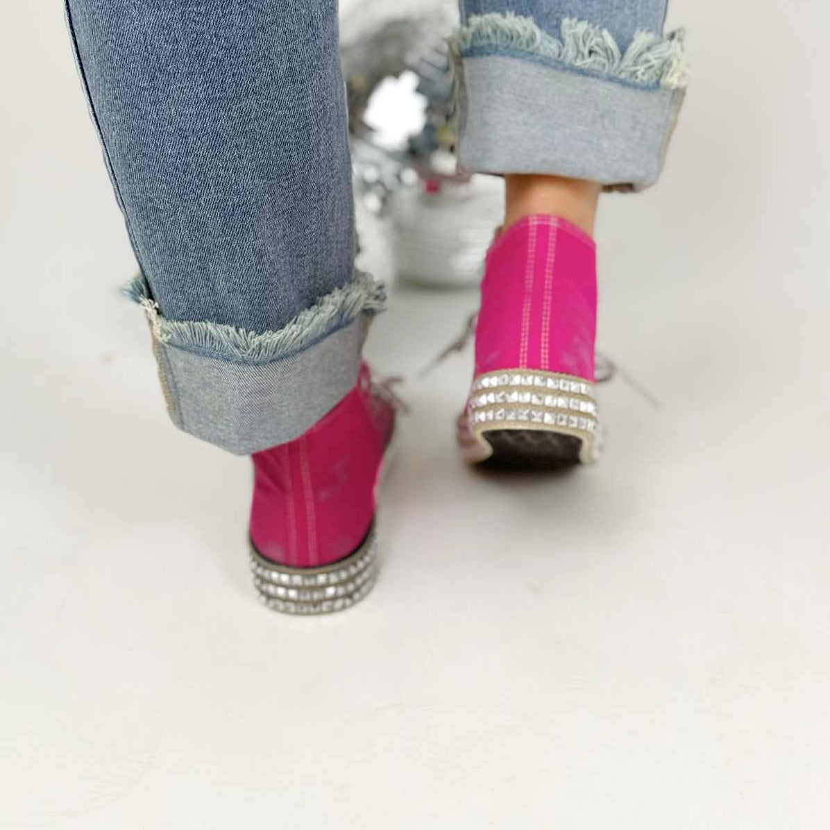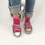 Introducing our iconic 6-eyelet hightop sneaker model, a fusion of timeless design and contemporary flair. This distinctive footwear masterpiece is meticulously hand-wrapped with pyramid studs, featuring a polished nickel finish that harmoniously complements the accompanying lace accessory.